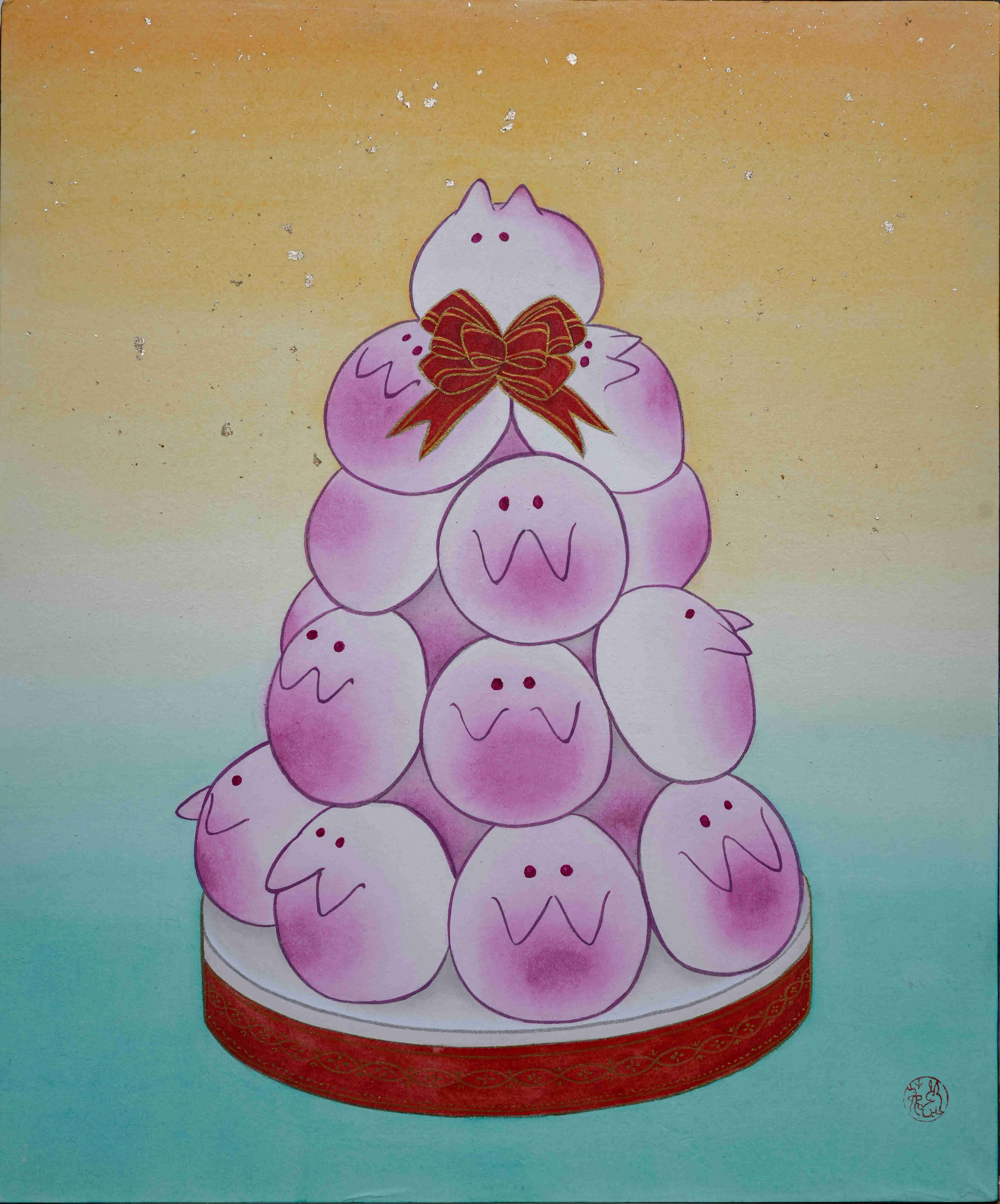 - 簡介: 作品主題以粉嫩、可愛、療癒的氛圍為核心,畫面中描繪了一系列夢幻場景:剛從蒸籠中冒著熱氣出爐的小 兔包、從象徵長壽的大壽桃中跳出的小兔包群,和隨處可見的五彩繽紛金平糖,宛如一場甜蜜的童話盛宴。 這些元素不僅象徵著歡樂與甜美,也承載著溫暖的記憶與文化情感。 創作手法上,作品結合了傳統工筆技法的精緻細膩與當代藝術的材質創新。筆觸輕盈細膩,以水墨層疊表現 包子柔軟的質感,並在兔包的外皮上增添淡粉紅的暈染,營造出剛蒸熟的蓬鬆感。輔以金箔與珠光效果,使 整體畫面更具夢幻氣息,展現出點心不僅僅是味覺的享受,更是一種視覺的盛宴。 這件作品旨在以工筆水墨的形式重現兒時熟悉的傳統小點心,並通過粉嫩的色調與華麗的材質,呈現一種甜 蜜療癒的氛圍。希望觀者在欣賞的同時,能回味那段無憂無慮的童年時光,並重新審視傳統文化與現代藝術 交融的可能性。