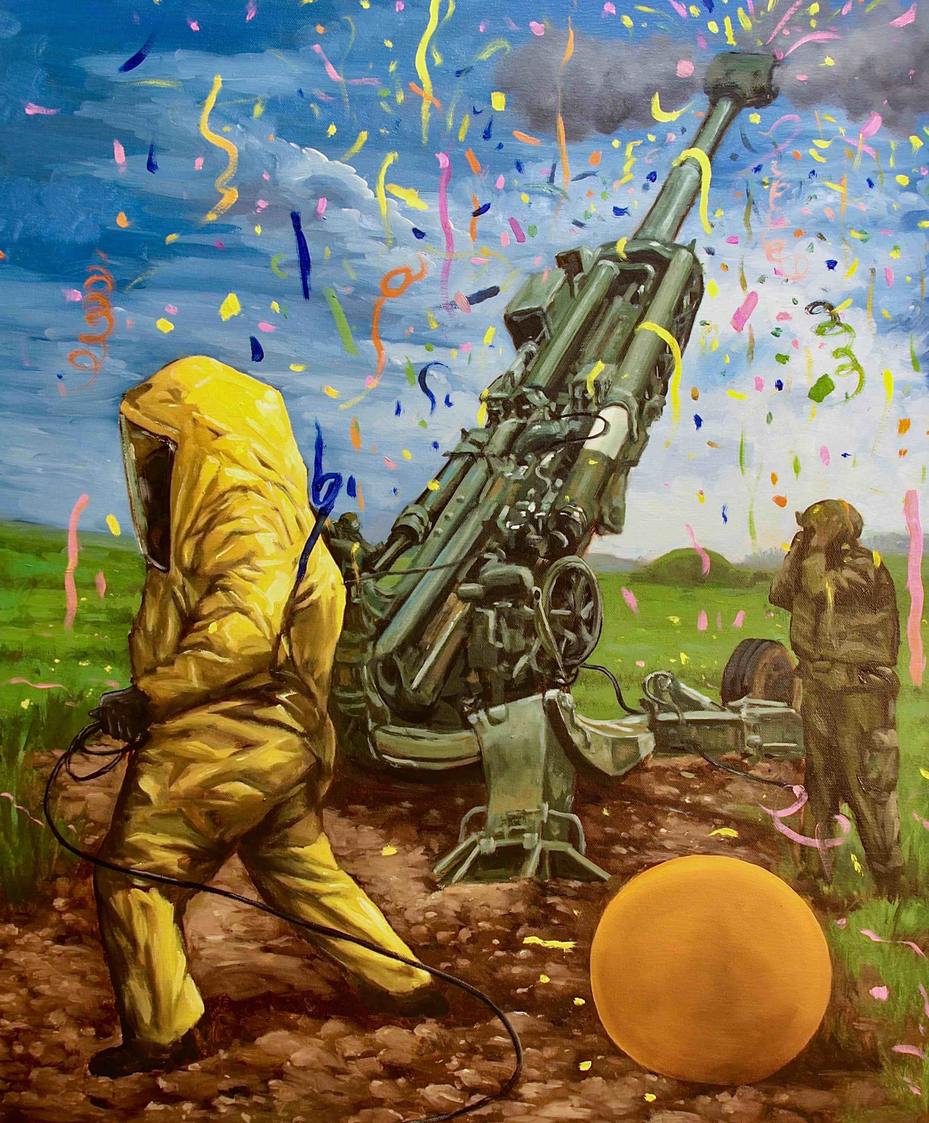 - 簡介: 盧冠宏的創作常將不同場景與人物湊在一起。所謂「不同」,有時是視覺而直觀的,有時是文化脈絡的錯置,藝術家據此調度與建構作品於敘事和意義方面的模糊語境。同時,也偷渡個人的惡趣味於作品中。 本作續自2018年描繪身著防化服人的小系列。時隔幾年,此系列自初始僅為呈現奇觀與孤寂,轉為藝術家對現實氛圍的觀察映照。尤在疫情間,一切真實似乎都來自「窗外」的影像。如今,當全世界已然共擁彷若末日之後(aftermath)的經驗,此種若即若離、但生活仍要繼續的不協調感於我更顯立體。 作品挪用、抽換了著名兒童節目中的樂園場景,企圖呈現亦假亦真的不協調感,並透過繪畫重新拼裝、詮釋自己所見的世界,回應自身認為的時代氛圍與日常。