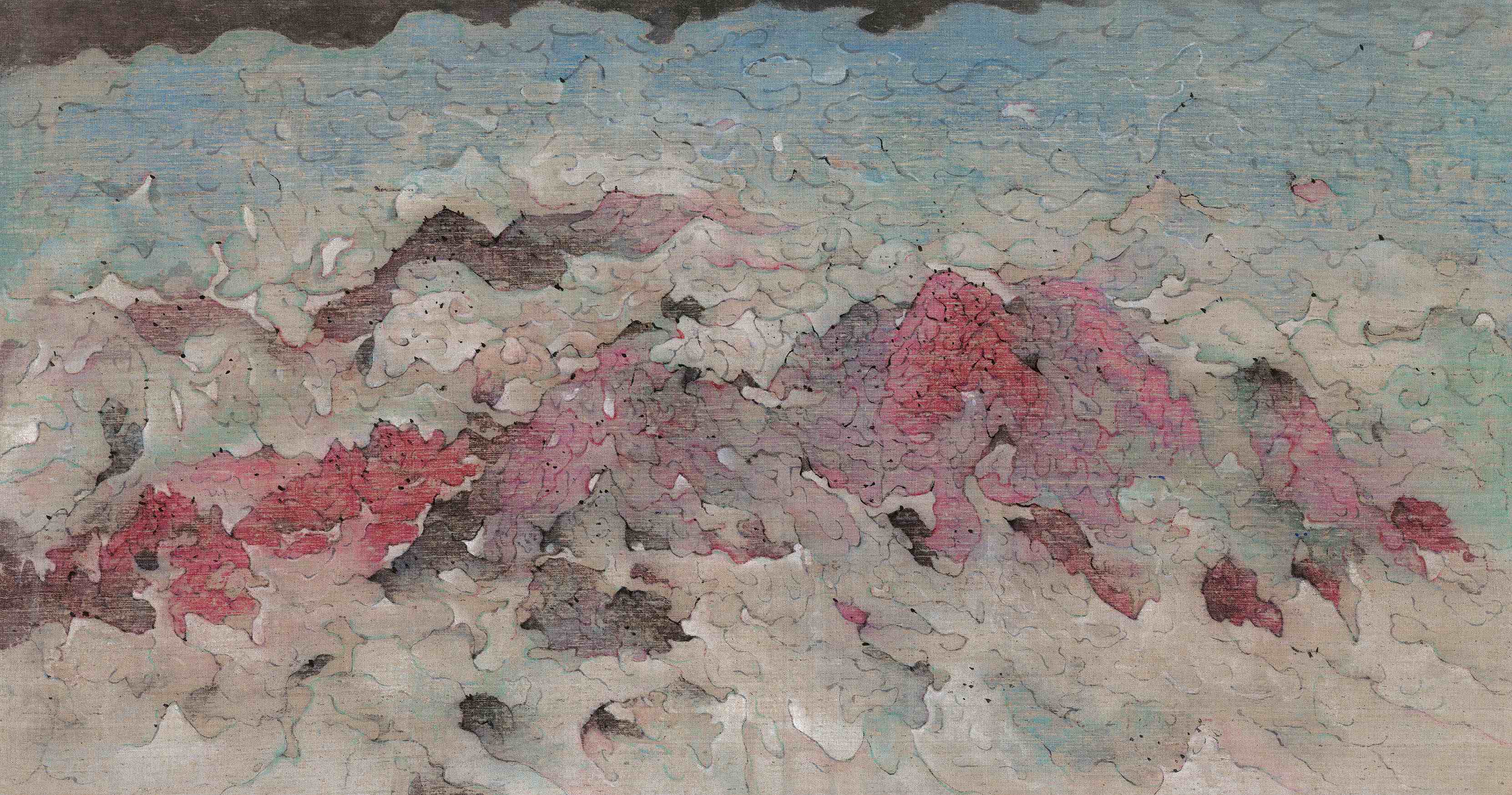 - 簡介: 自2018年起,楊新收開始使用質地略顯陽剛的粗絹,並從潑墨技法轉向使用寬筆刷墨,使作品表現上更為自由且充滿力度。粗絹上均散的天然黑點以及藝術家創作尾聲所加重的墨點,與傳統的「苔點」用意有所區別。「苔點」通常用於分辨山群的前後感,不僅是表現自然景物質感和紋理的重要技法,還具有豐富畫面層次、增添空間感、平衡構圖的功能。通過苔點的疏密變化,畫家能夠強調空間的深度,增添意境與生氣,使得整幅作品在技法與內涵上更加豐富和深邃。而楊新收作品中的「墨點」可被視為自然界的精華,凝聚了天地之氣,使得畫面如同罩上一層風格濾鏡,創造出一種如同花崗岩上疏密有致的雲母粒子分佈於虛空中的狀態。粗絹上原有凸起的纖維黑點,與錯落分布的墨點相結合,不僅突破了空間的限制,更標誌了時間的痕跡和氣韻的節點。此粗絹經過輕膠礬處理,更能強調紋理的清晰度,適合沒骨山水的表現,使墨與色料在畫面上層層交融,卻又在絹絲中若隱若現,產生「藏」與「露」的視覺趣味。由於纖維錯散,遠觀之下,畫面宛如目光穿透文人居室中竹製卷簾時所眺望到的風景,那一條條橫幅的纖維恰似竹簾,隱隱透出古雅的韻味,將自然之景與人文之思完美融合。 (節錄)