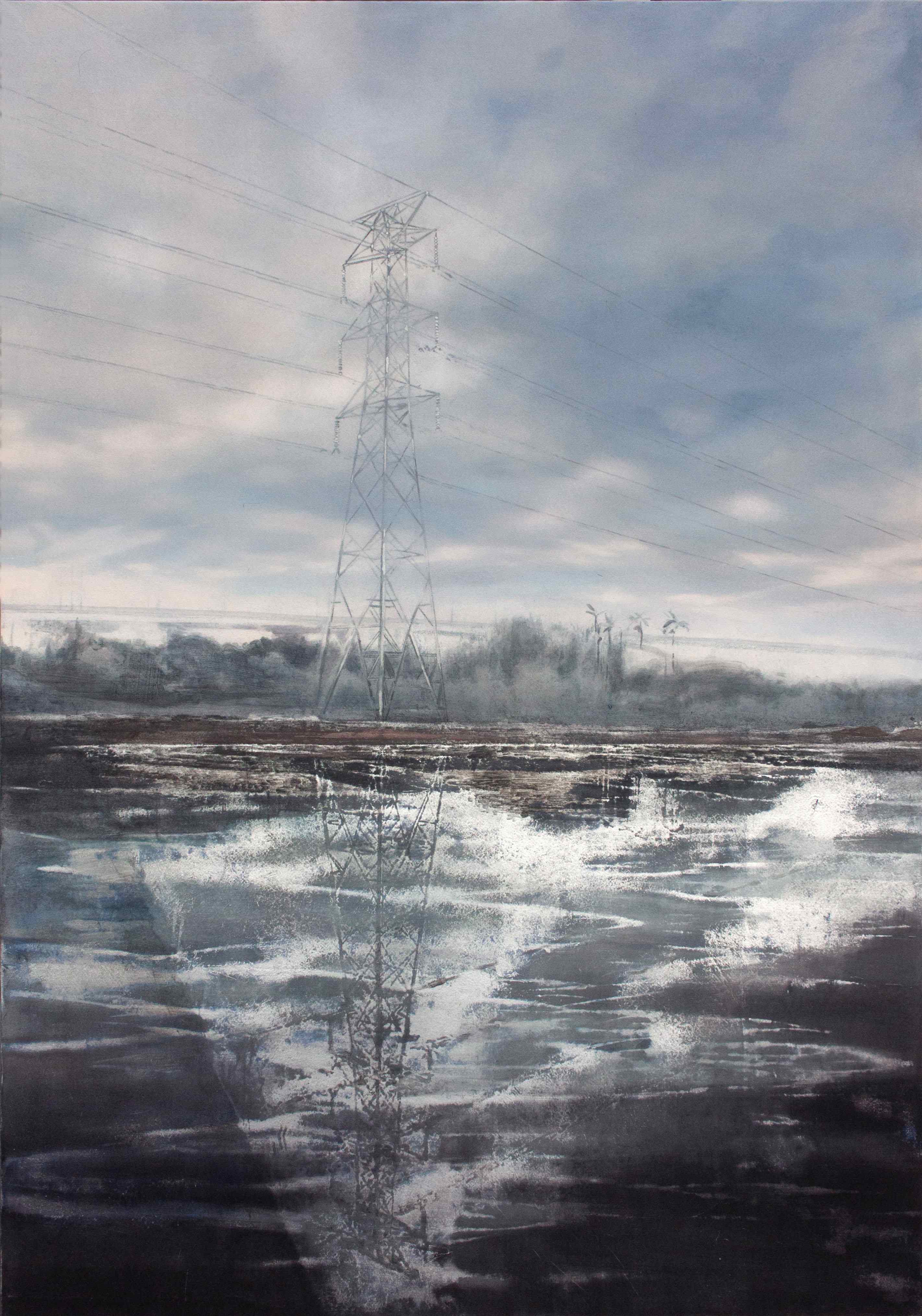 雨後出行,踏青間偶然經過一處水田畔,一座高壓電塔聳立其中,電纜橫跨天際,與遠方的高架道路交織成獨特的景象。微光穿透層疊的雲層,映照在鏡面般的水田上,勾勒出台灣特有的風景。