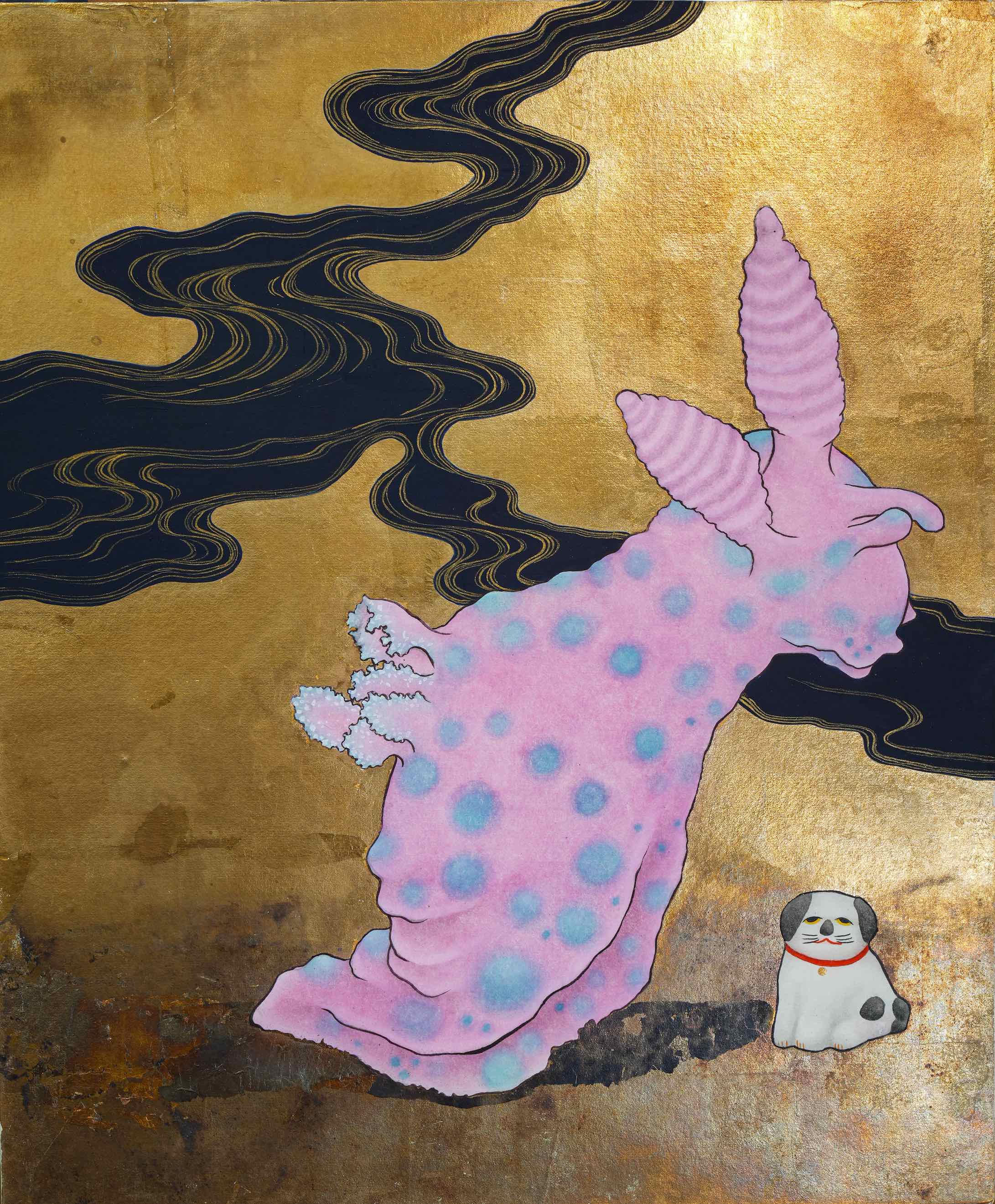 - 簡介: 作品主題以粉嫩、可愛、療癒的氛圍為核心,畫面中描繪了一系列夢幻場景:剛從蒸籠中冒著熱氣出爐的小 兔包、從象徵長壽的大壽桃中跳出的小兔包群,和隨處可見的五彩繽紛金平糖,宛如一場甜蜜的童話盛宴。 這些元素不僅象徵著歡樂與甜美,也承載著溫暖的記憶與文化情感。 創作手法上,作品結合了傳統工筆技法的精緻細膩與當代藝術的材質創新。筆觸輕盈細膩,以水墨層疊表現 包子柔軟的質感,並在兔包的外皮上增添淡粉紅的暈染,營造出剛蒸熟的蓬鬆感。輔以金箔與珠光效果,使 整體畫面更具夢幻氣息,展現出點心不僅僅是味覺的享受,更是一種視覺的盛宴。 這件作品旨在以工筆水墨的形式重現兒時熟悉的傳統小點心,並通過粉嫩的色調與華麗的材質,呈現一種甜 蜜療癒的氛圍。希望觀者在欣賞的同時,能回味那段無憂無慮的童年時光,並重新審視傳統文化與現代藝術 交融的可能性