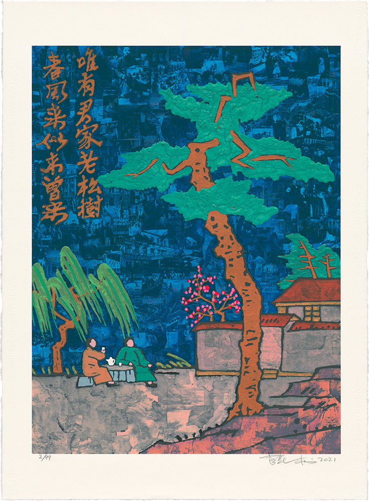 - 簡介: 高士畫廊製作的薛松版畫,係經薛松授權圖象、參與製作、親自簽名、限量發行的手工製作絲網版畫。採用薛松代表性作品圖象,手工分色、製版、校色、絹印。使用多種版畫顏料,經層層疊加印製,達到色彩飽合、肌裡豐厚、景深分明、光彩亮麗的視覺效果。製作過程複雜,極其難得,絕非機器噴繪品可比。 2014年,薛松應高士畫廊之邀,來台進行「台灣八景」創作之采風與資料收集,此《阿里山》即為其返滬後創作八景之一。薛松以小火車與櫻花,賦予阿里山清晰意象,櫻花繽紛,分外可人。輔以拼貼之日式花樣與中國傳統山水圖象,回應台灣歷史背景與多元文化。