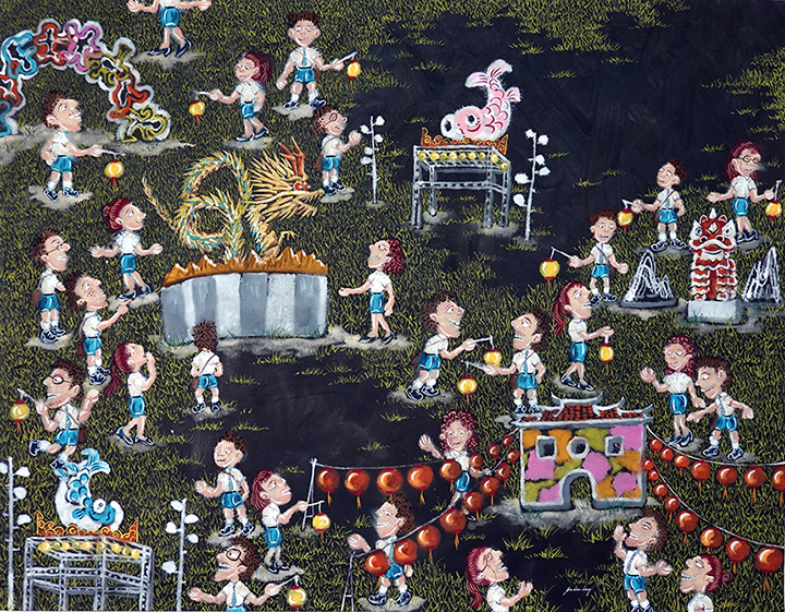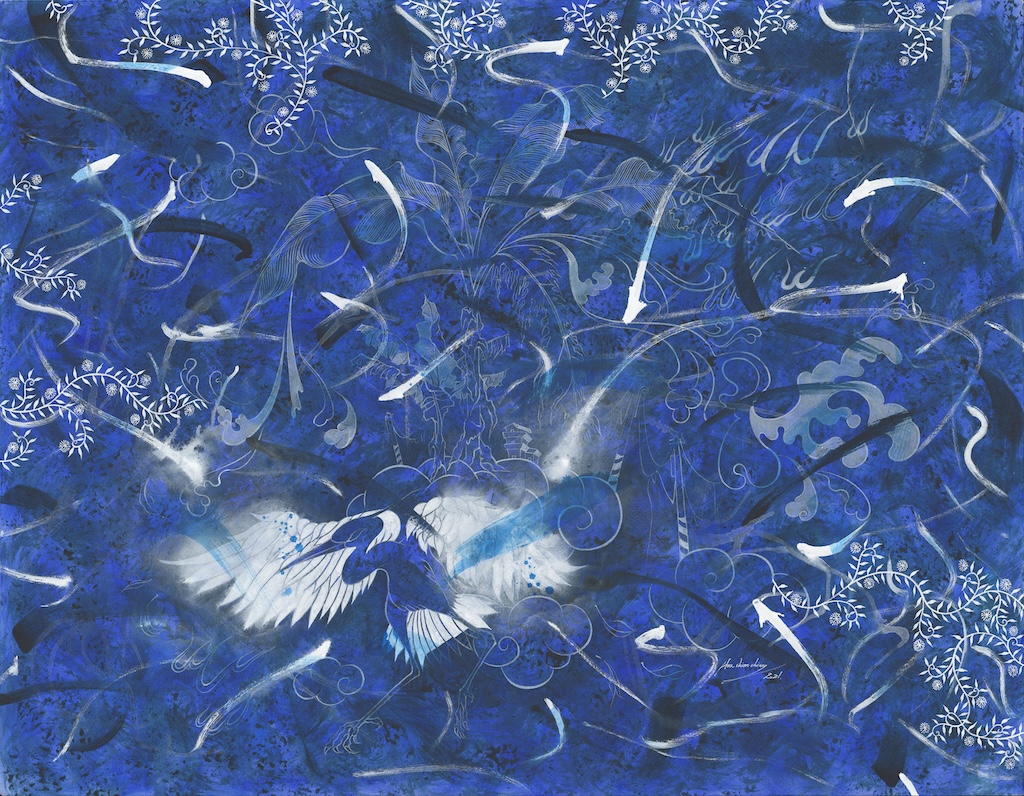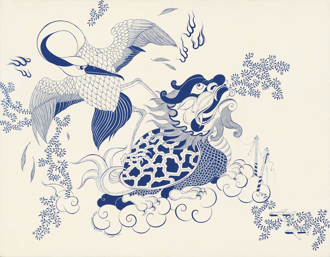 華建强慣以膠彩入畫,結合多種媒材反覆堆疊,用獨具一格的線條展現具象與抽象並行。2002年「人奸仙境」系列中化身與世無爭的小老頭,由本我出發關照生活周遭的發展情態。2013年「槍砲與西裝」將威權暴力視為兩面一體,藉此隱喻國族社會間層出不窮的掠奪與廝殺。2016年「從繪畫開始」,重新思考繪畫不僅只於描繪肉眼所見,更重要的是能對社會多做點什麼。2020年「空谷幽蘭」中自然界的藤蔓、昆蟲與花鳥匯聚一齊,以寂靜空谷中的幽蘭自居,模擬當下世界與嚮往世界的共合。2022以單色系青花瓷「藍」展現疫情時代對外在環境與自在本我的關注。此次展出新作「指定的夥伴」以在陽明山參與導覽解說員志工的經驗做為發想,藉由具體的景色及自然生命的共處關係,訴說人際間的相處,在互為的過程裡淬鍊、凝聚而成的共同信念。藉以尋求那些最契合的夥伴。為彼此帶來安定、和樂與舒適的覺知。