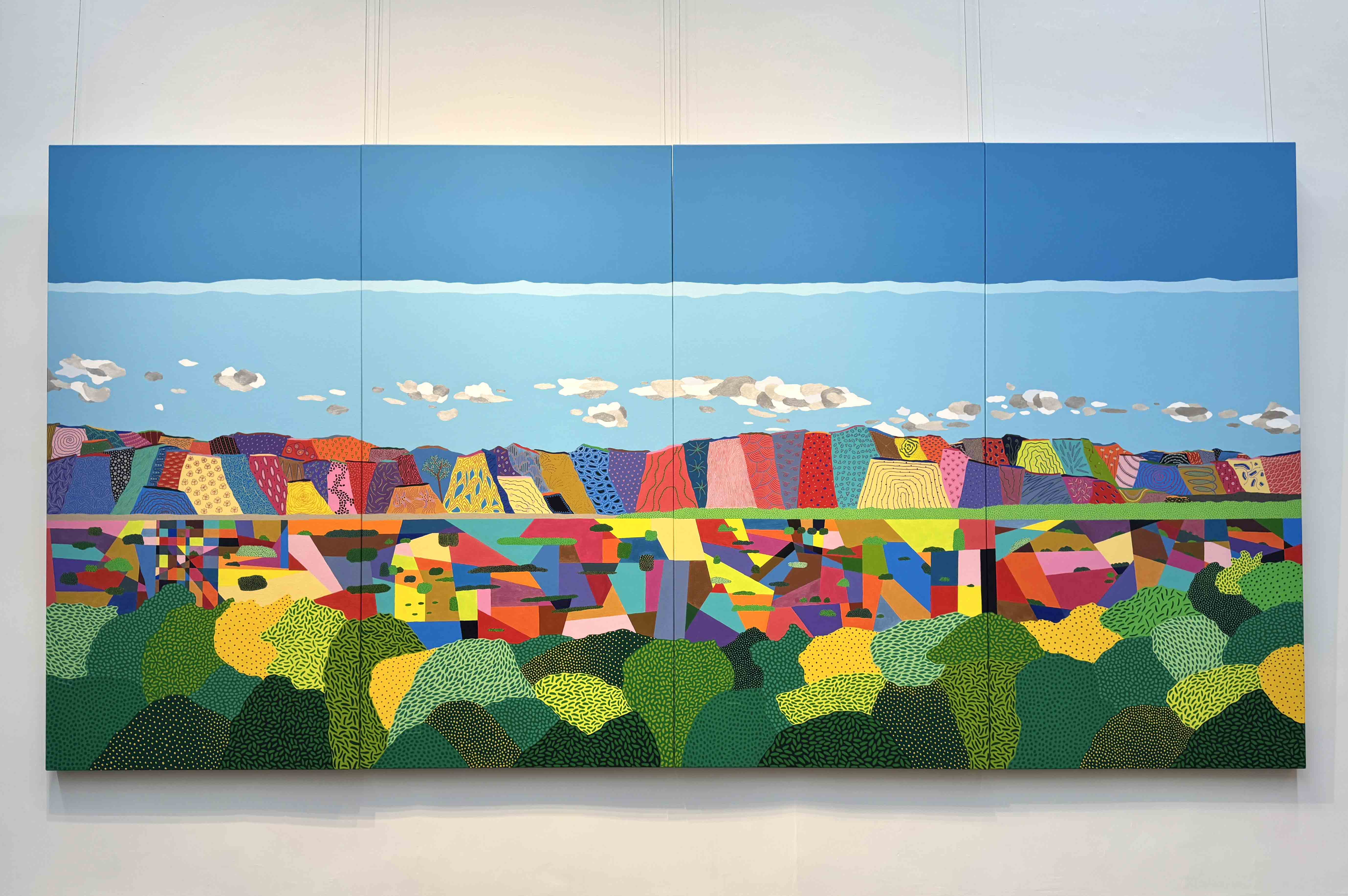- 簡介: 思念的美,像是兩座大縱山脈之間的縱谷。 遙遙相望,卻在風裡回應彼此。 面前林間的樹叢,遮住了山腳下混雜的情緒。 縱谷之中,幾何與色塊交錯取代了房屋與田野, 跳動的顏色,如音符代替了話語, 風景成了一場無聲的對話。 我跟你說,只要你跳得夠高,就能越過遠處的海岸山脈, 望到那一望無際的太平洋,在天際變幻的雲朵也會為你鼓掌。 天空像海一樣寬廣,風中有鹽的味道, 張開雙手吧!去擁抱那無邊的藍。