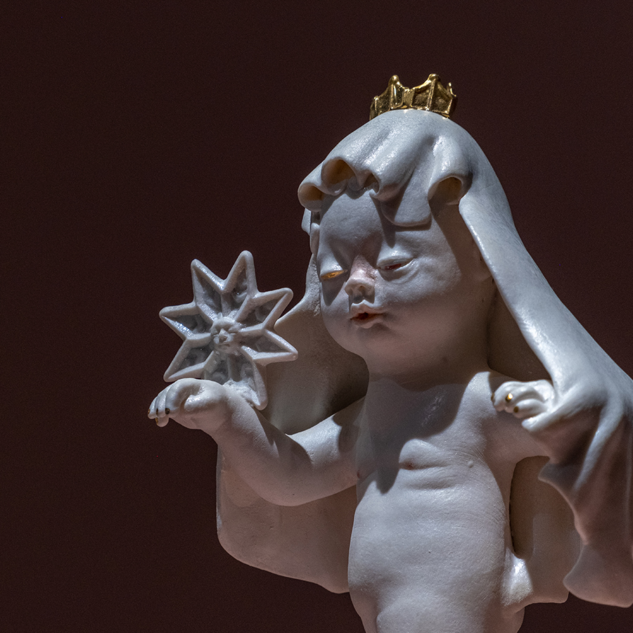然而,被聖光袈裟所覆蓋的聖子,究竟如何能擁有神通般的力量,去拯救他人?作品《聖徒》揭示了一種「被動地接受神聖冠冕」的嬰孩形象,他被賦予治癒眾生的使命。雖然只是平凡的孩子,即便只是以「神童」的姿態示人,仍能在苦難之中帶來安慰與撫慰。這樣的存在,正是一種神童轉世的象徵。