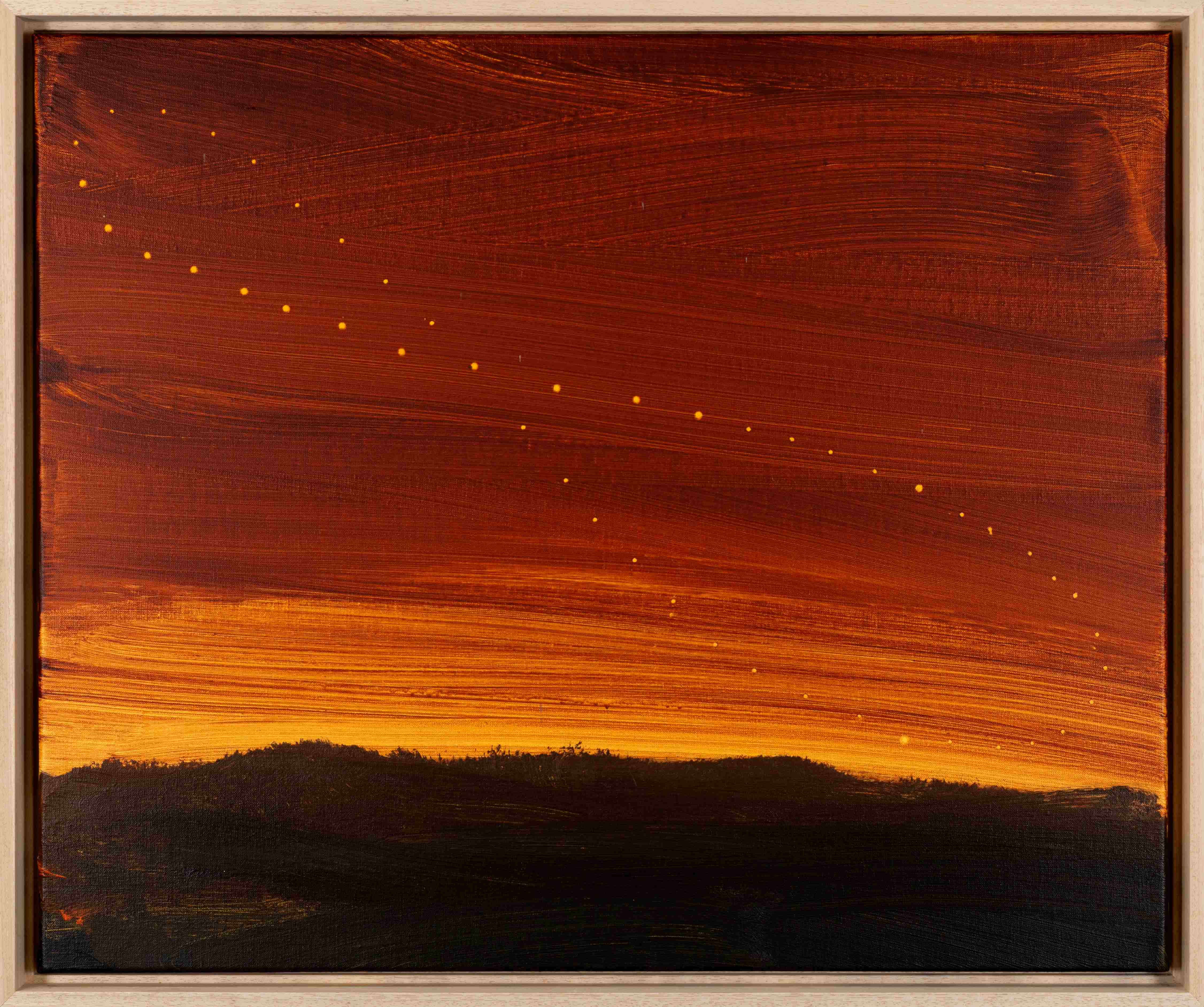 《Analemma》捕捉了夕陽餘暉下的天際,畫布上細小的點狀排列暗示著太陽一年中在天空留下的軌跡。這條不尋常的「天文曲線」讓觀者意識到時間的流動與自然的秩序。作品以簡潔而深邃的手法,將日常風景轉化為宇宙尺度的冥想。