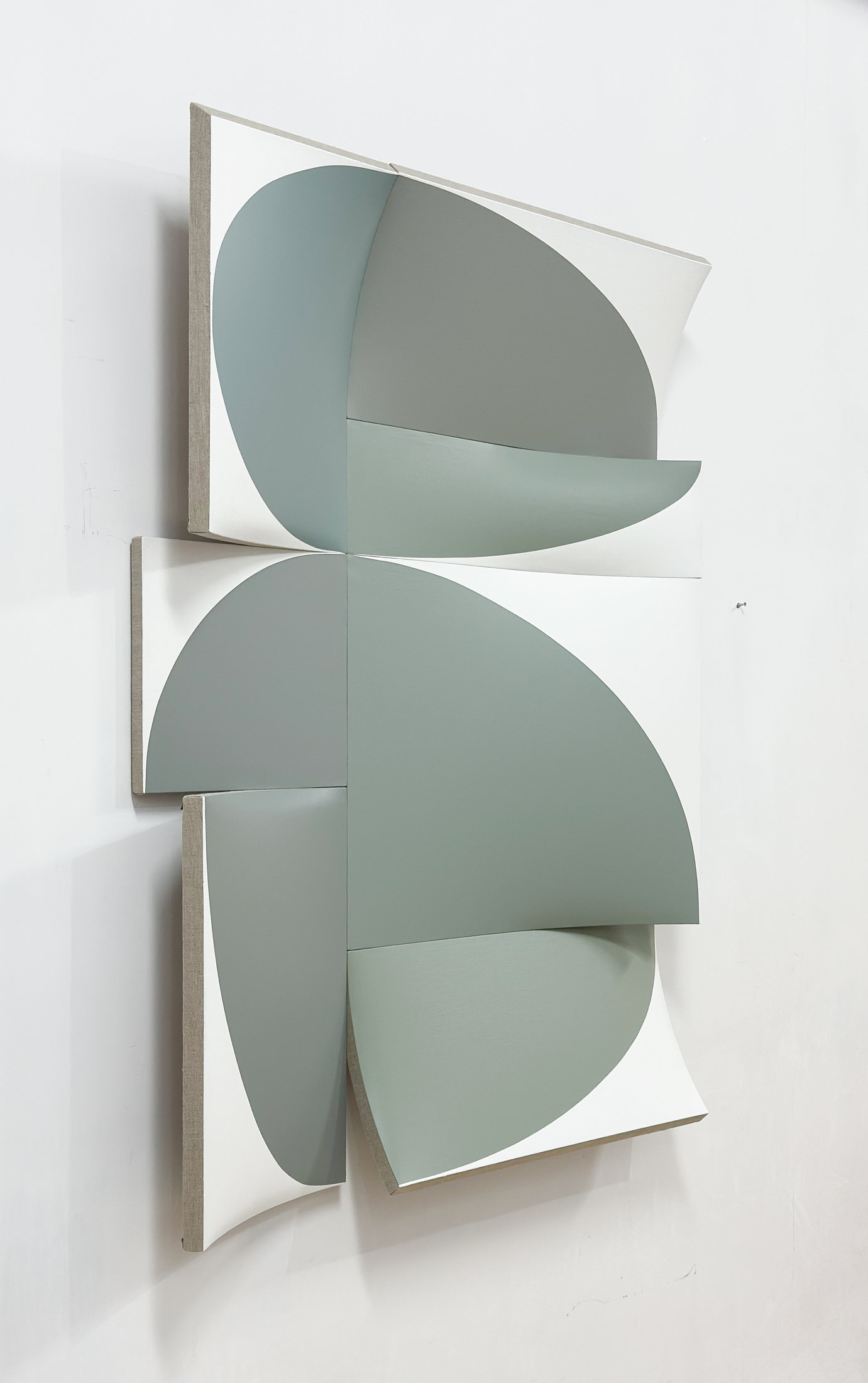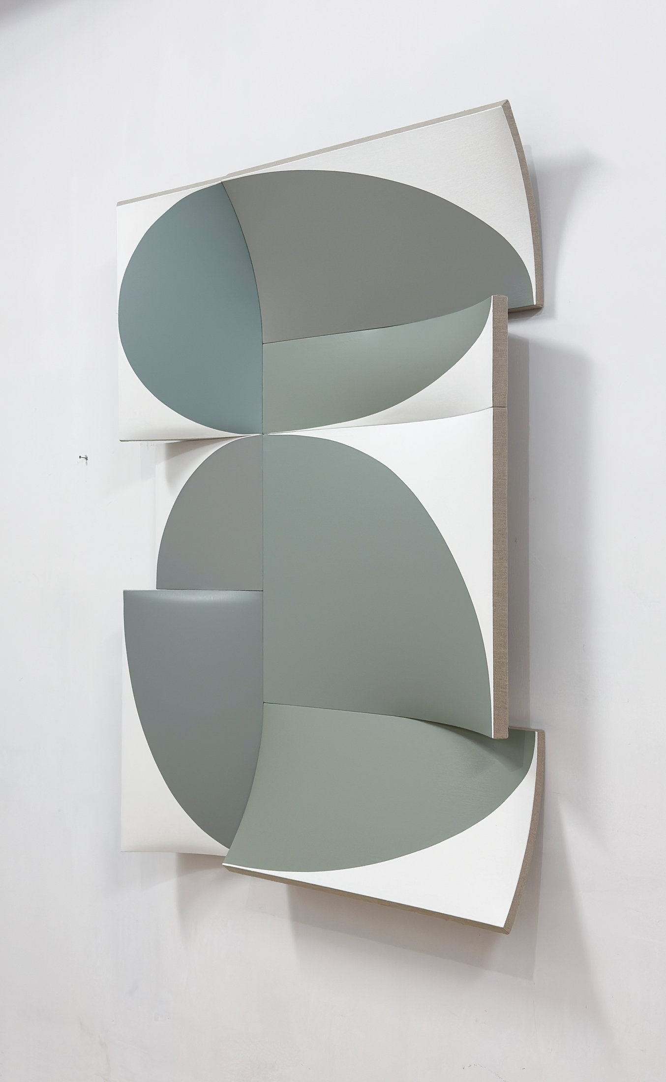 《灰色平衡》展現了Jan Maarten Voskuil對繪畫空間的精準掌握。作品由多個弧形模組組構而成,冷灰與白色的交錯營造出微妙的平衡感。畫布不再只是平面,而是被推擠、折疊與彎曲,呈現出如同雕塑般的張力。透過這種結構性的實驗,藝術家挑戰繪畫的邊界,使其遊走於二維與三維之間。
