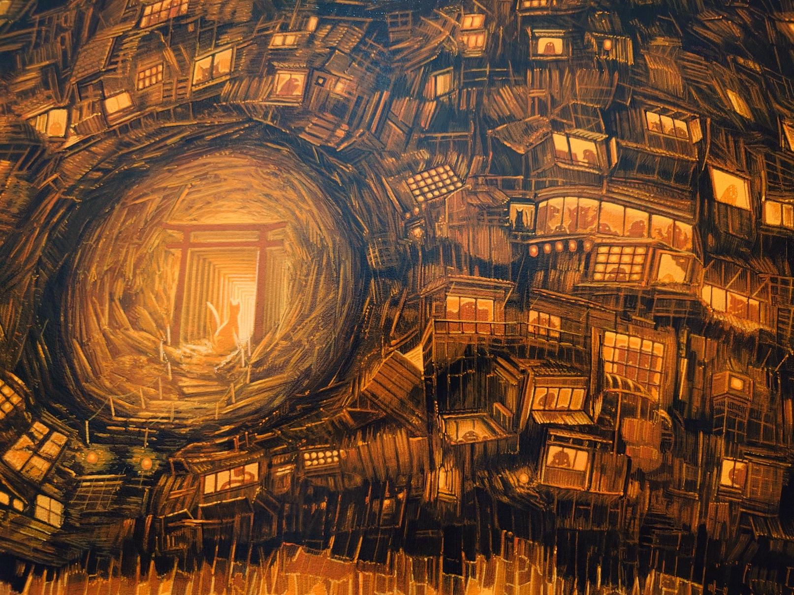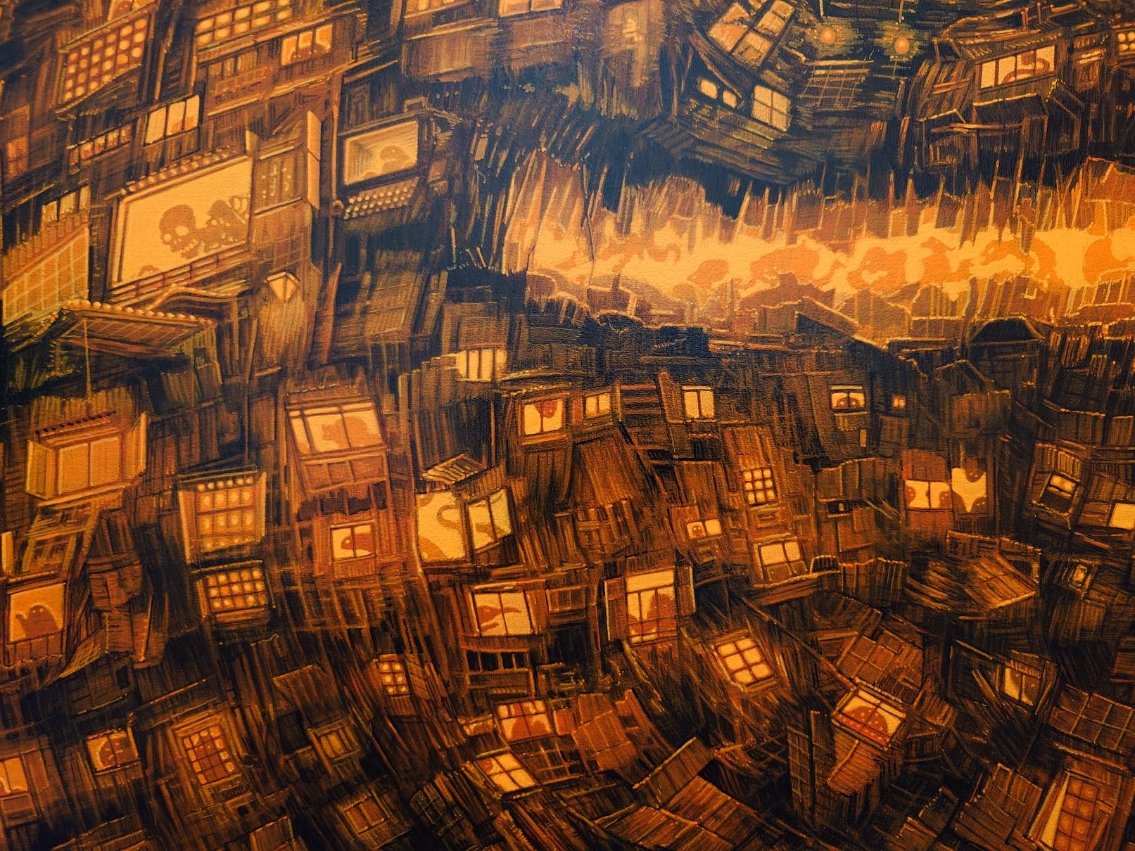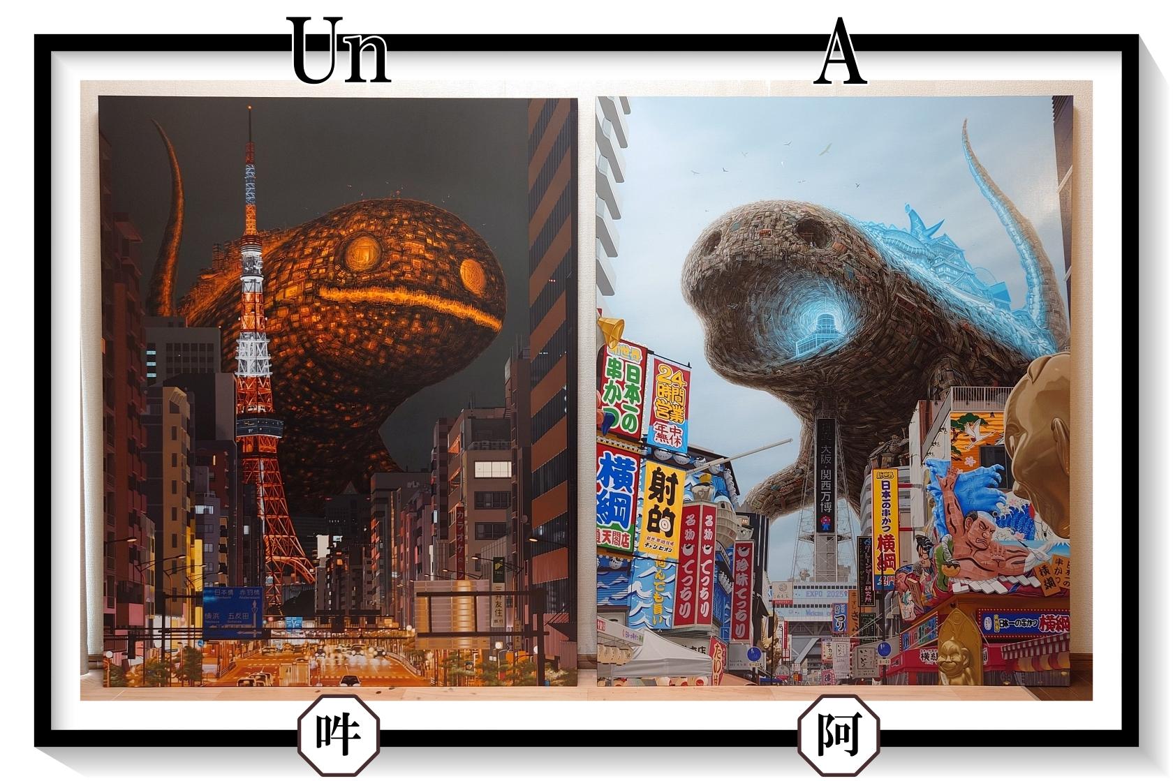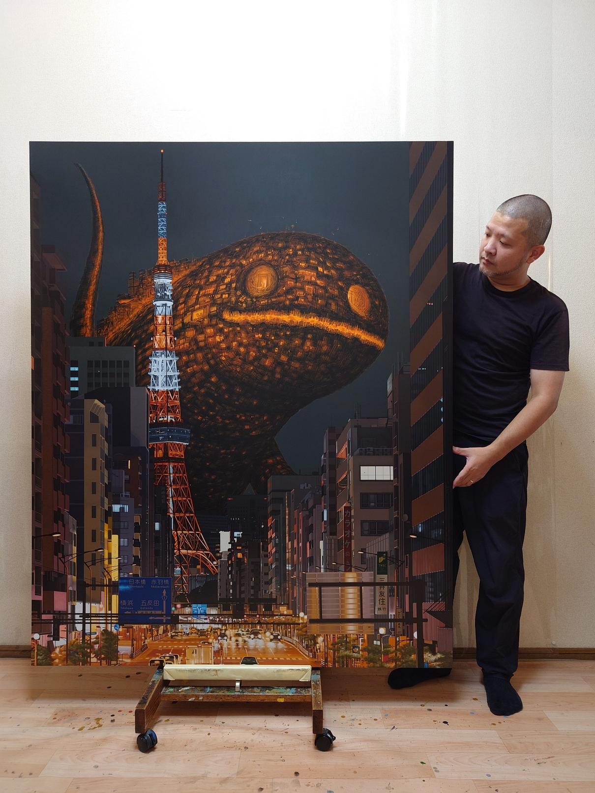 - 簡介:                            由無數垃圾與碎片構成的怪獸,象徵著曾經珍視的記憶殘骸,同時也是當今大量消費社會中「付喪神」的集體化身。 這個同時帶有「可愛」與「詭譎威脅」的存在,正是人類社會的一面鏡子——融合了日本獨特的角色文化、妖怪、怪獸以及神性的意象。 在這個系列中,我描繪了這樣的怪獸於兩座不同的城市——東京與大阪——突然現身的瞬間,有時靜默無聲,有時伴隨震耳欲聾的咆哮。這種對比正如日本守護神像中所呈現的「阿吽」結構,象徵著萬物的始與終,從張口的「阿」到閉口的「吽」。阿吽同時也承載著守護神驅邪避凶的角色。 我將一種祈禱般的願望寄託在這些怪獸之中——願它們能夠守護這個時代「某種本質的存在」。 這件作品描繪的是怪獸在東京夜晚靜靜現身的場景。牠的身體發出光芒,彷彿在回應這座不眠都市的璀璨輝煌,成為一種無聲的警示,提醒人們那永無止息、從未歇息的能量所潛藏的危險。