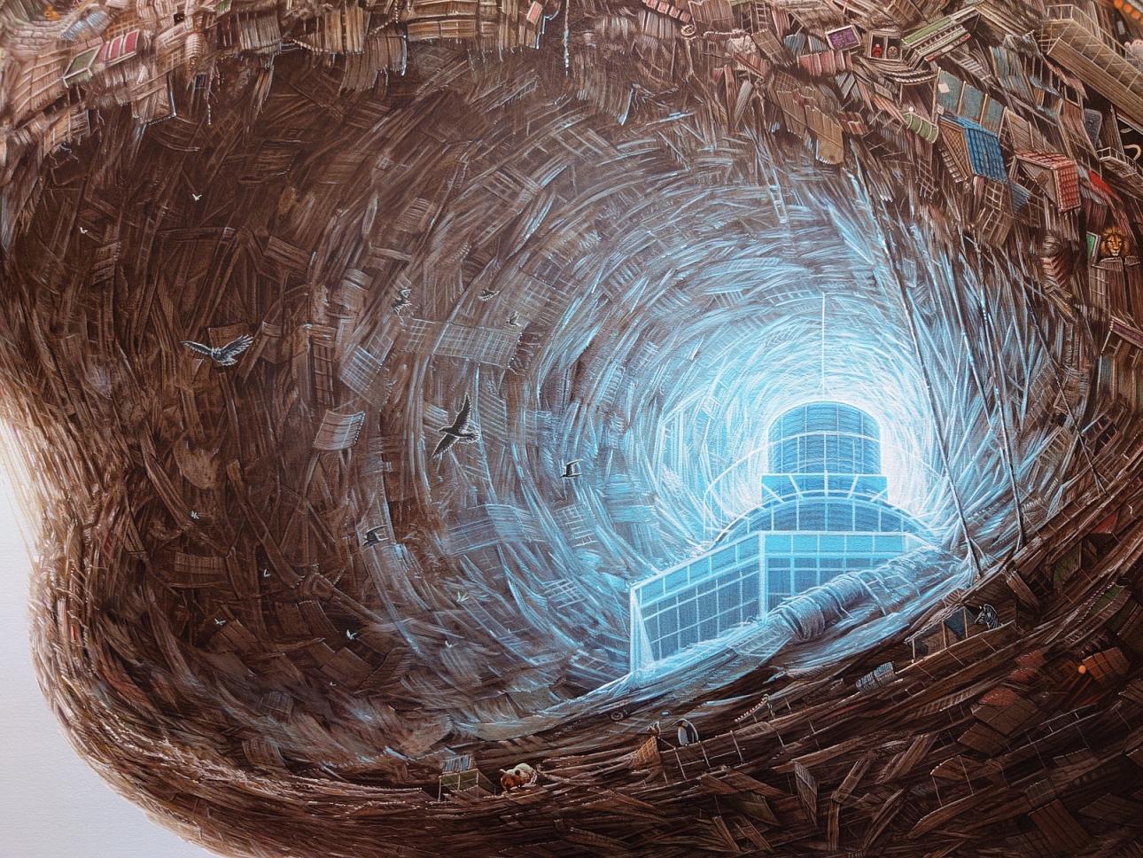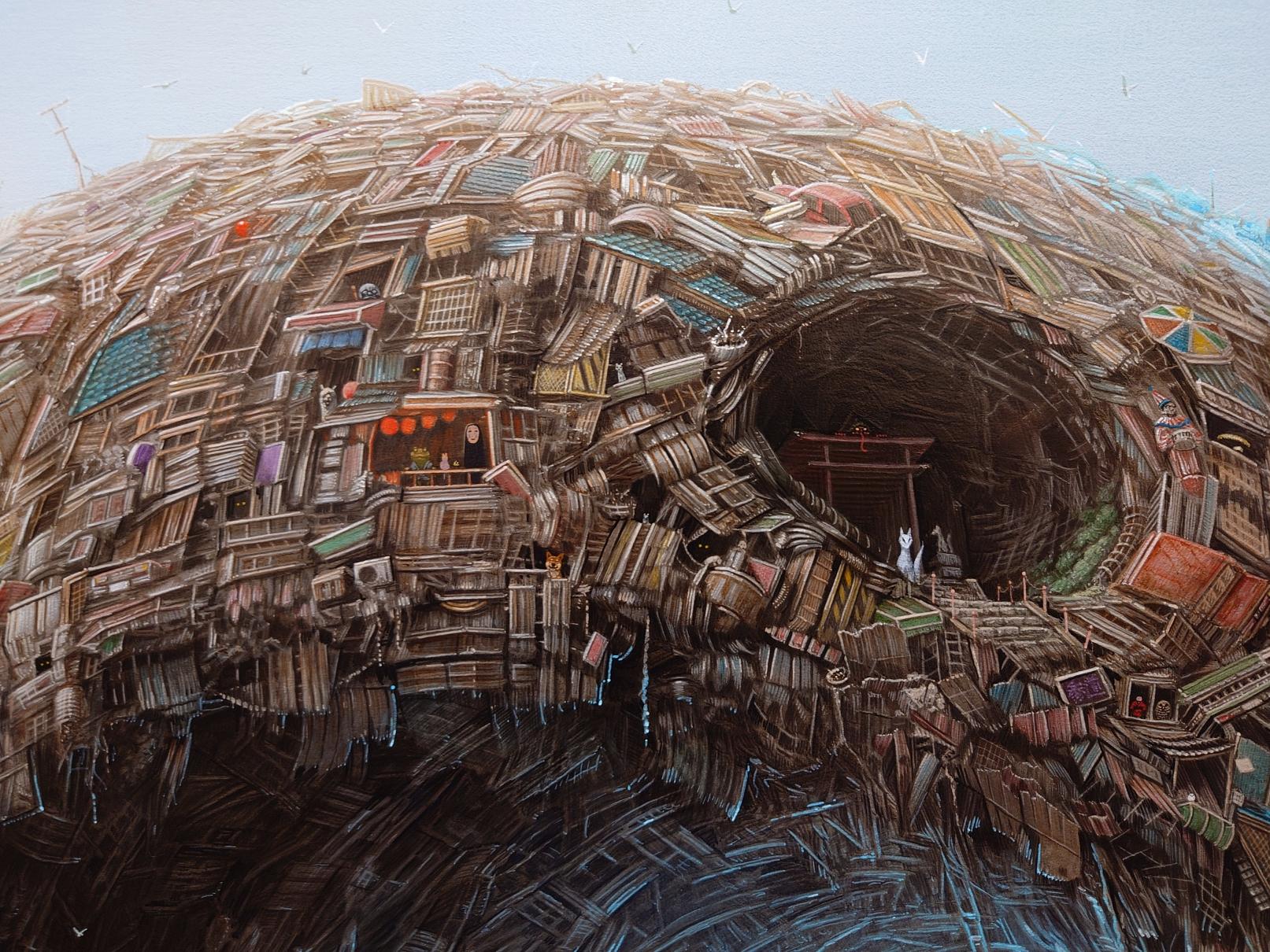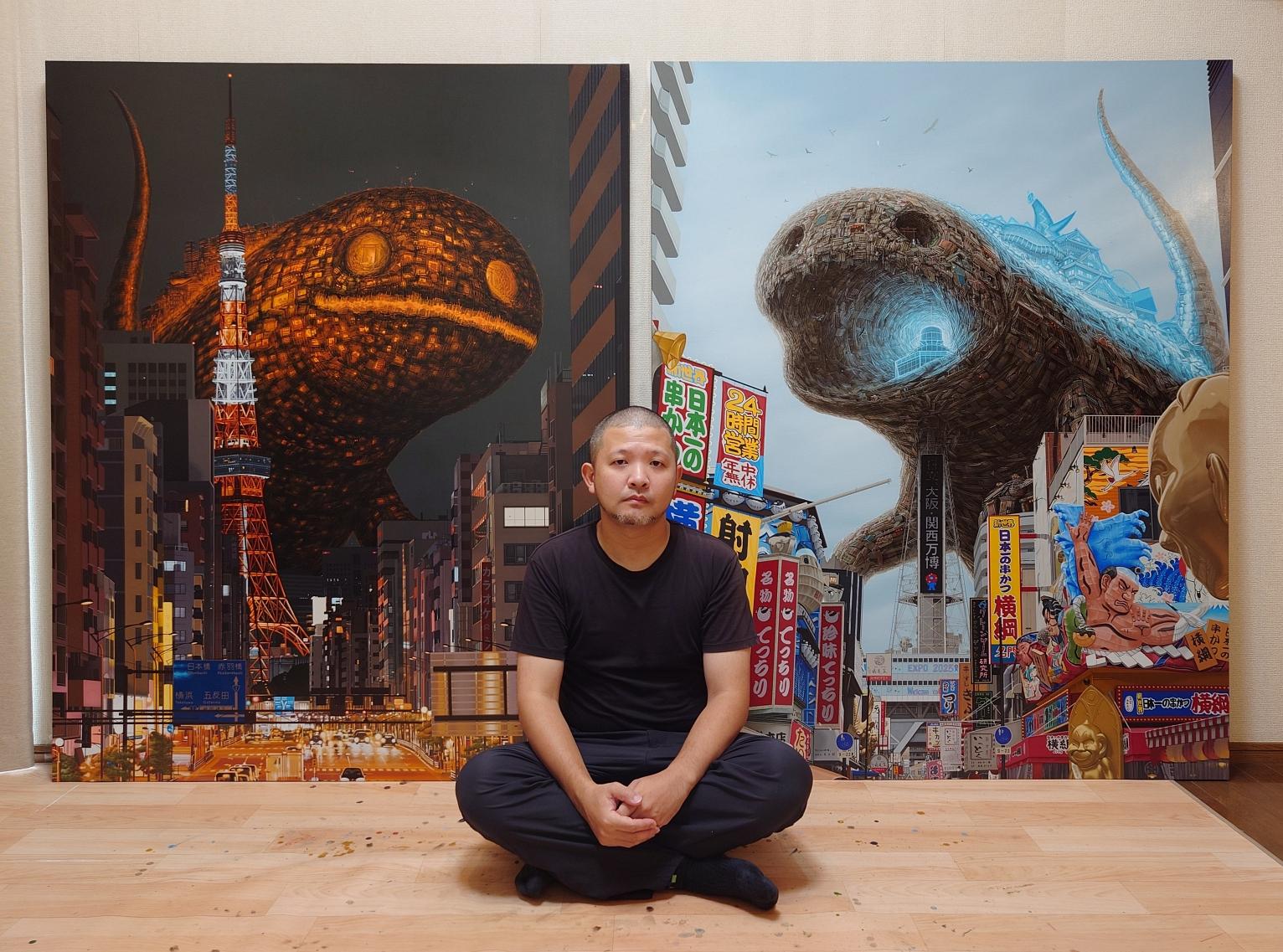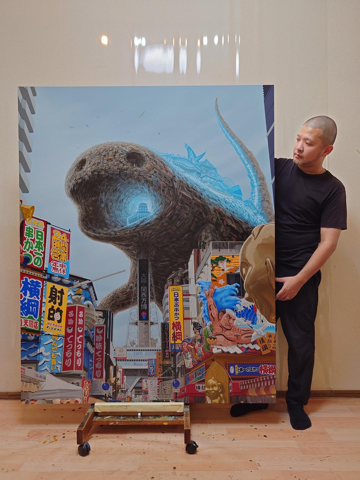 - 簡介:                            由無數垃圾與碎片組成的怪獸,象徵著曾經珍視的記憶殘骸,同時也是當今大量消費社會中「付喪神」的集體化身。 這個同時帶有「可愛」與「詭譎威脅」的存在,正是人類社會本身的一面鏡子——融合了日本獨特的角色文化、妖怪、怪獸以及神性的意象。 在本系列中,我描繪了這樣的怪獸在兩座不同的城市——東京與大阪——突然現身的瞬間,有時靜默無聲,有時則伴隨轟鳴咆哮。兩者的對比如同日本守護神像中所見的「阿吽」結構,象徵著萬物的始與終,從張口的「阿」到閉口的「吽」。阿吽同時也承載著驅邪避凶的守護神角色。 我在這些怪獸之中寄託了一種祈禱般的願望——願它們能夠守護這個時代「某種本質的存在」。 這件作品描繪的是怪獸突然出現在大阪市的場景。牠張開巨口,身體散發著詭異的藍白色光芒,佇立於萬人雲集的世博會前,令人感受到一種對未知未來的不祥預兆。