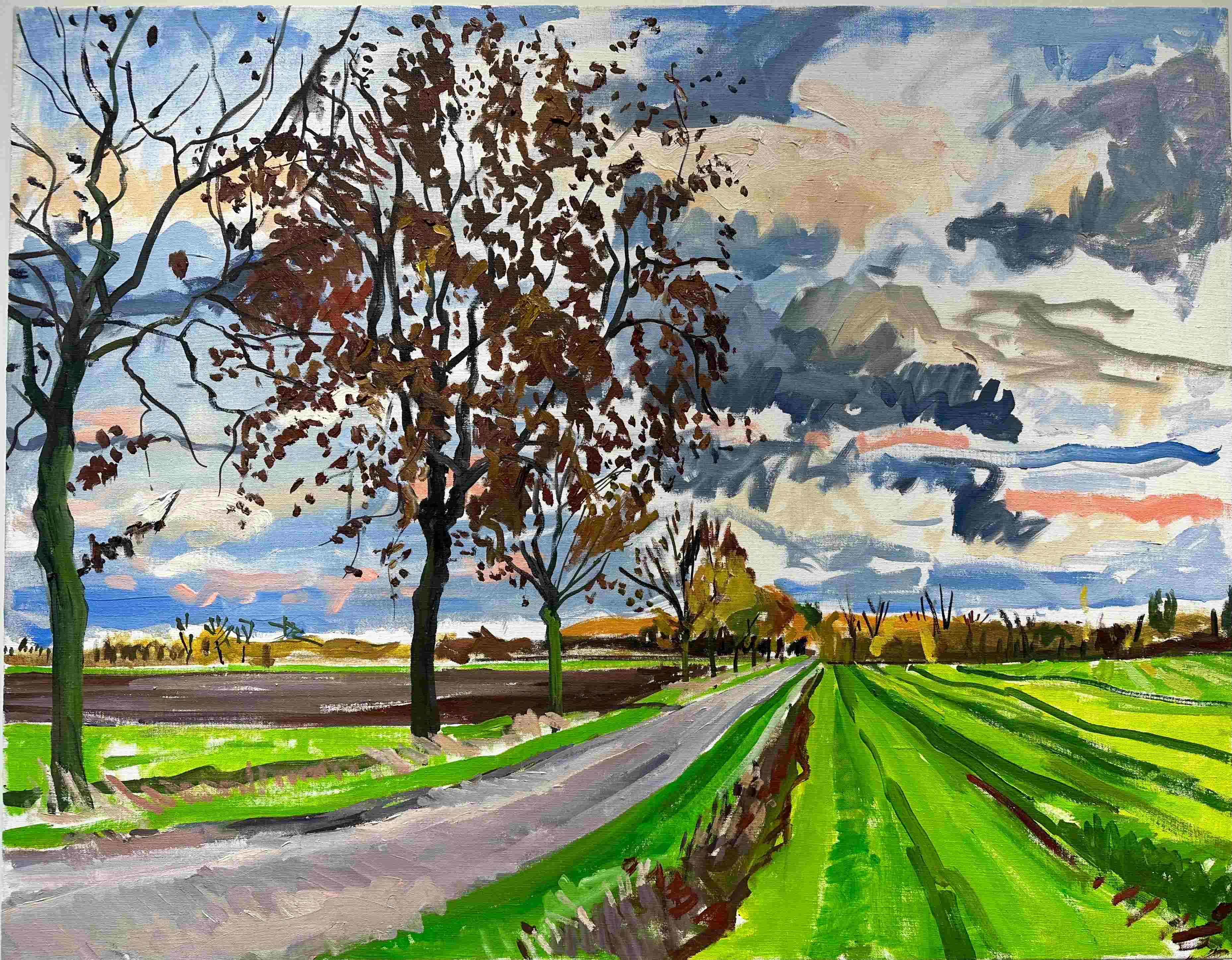 這幅作品描繪了阿徹胡克(Achterhoek)地區特有的「庫里森」(Coullisen)風景:一層接一層的樹木與田野,彷彿幕簾般相互交疊。蜿蜒的小路貫穿其中,引導觀者的視線延伸至無盡的遠方。畫面中,明亮的草地與陰鬱的天空形成強烈對比,不僅捕捉了荷蘭鄉間的光影變化,也表現出自然景觀中連續與無窮的詩意。