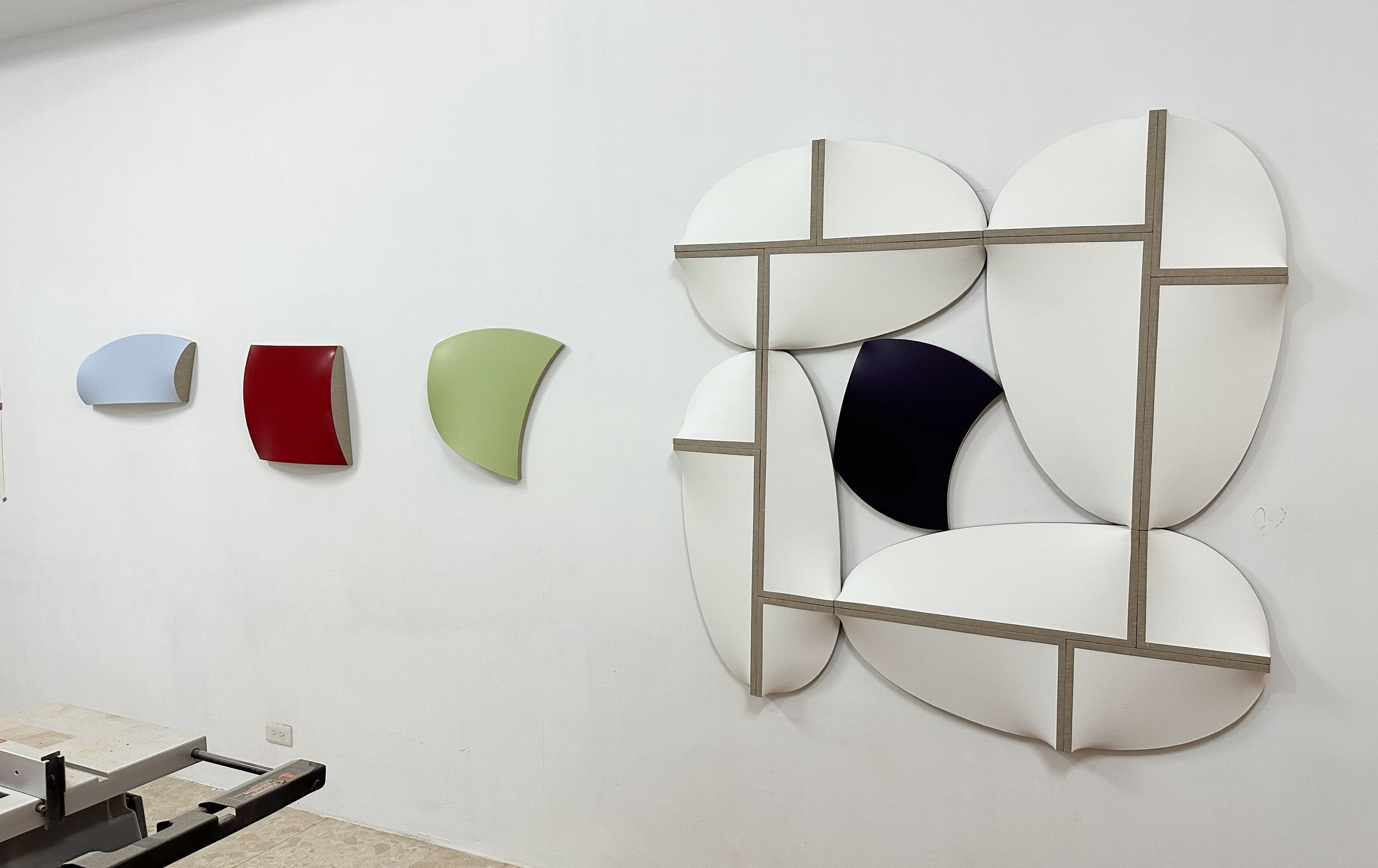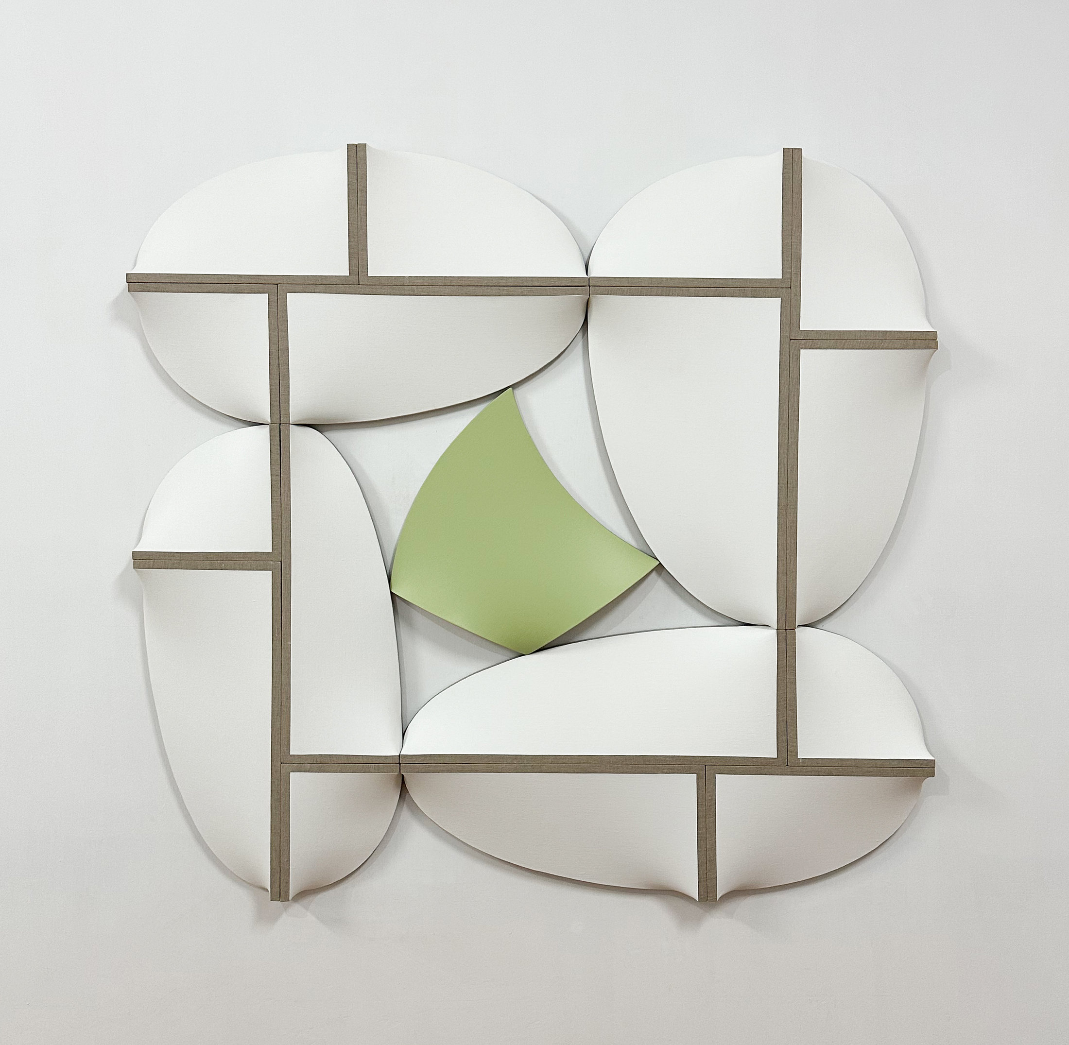 《文字的起源》延續了Jan Maarten Voskuil對繪畫與結構語言的探索。作品以白色與灰褐色的幾何模組組合而成,宛如抽象化的文字片段,讓人聯想到符號誕生之初的原始狀態。畫布的弧度與張力,使平面宛如浮雕,既是繪畫也是物件,挑戰觀者對文字、圖像與造形的既定分類。藝術家在此提出一個問題:語言與圖像的邊界,究竟從何開始,又如何在文化記憶中被不斷重構?