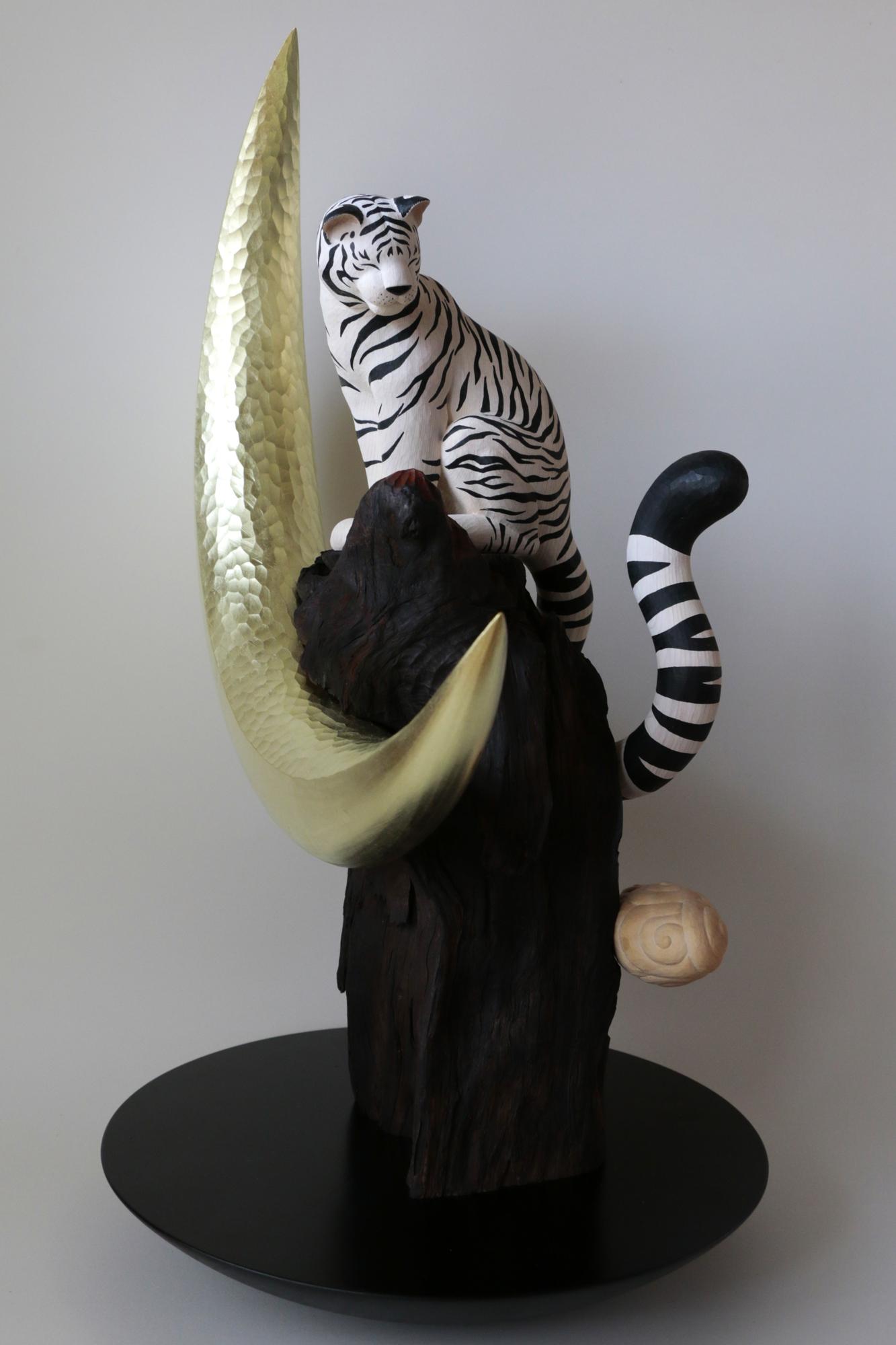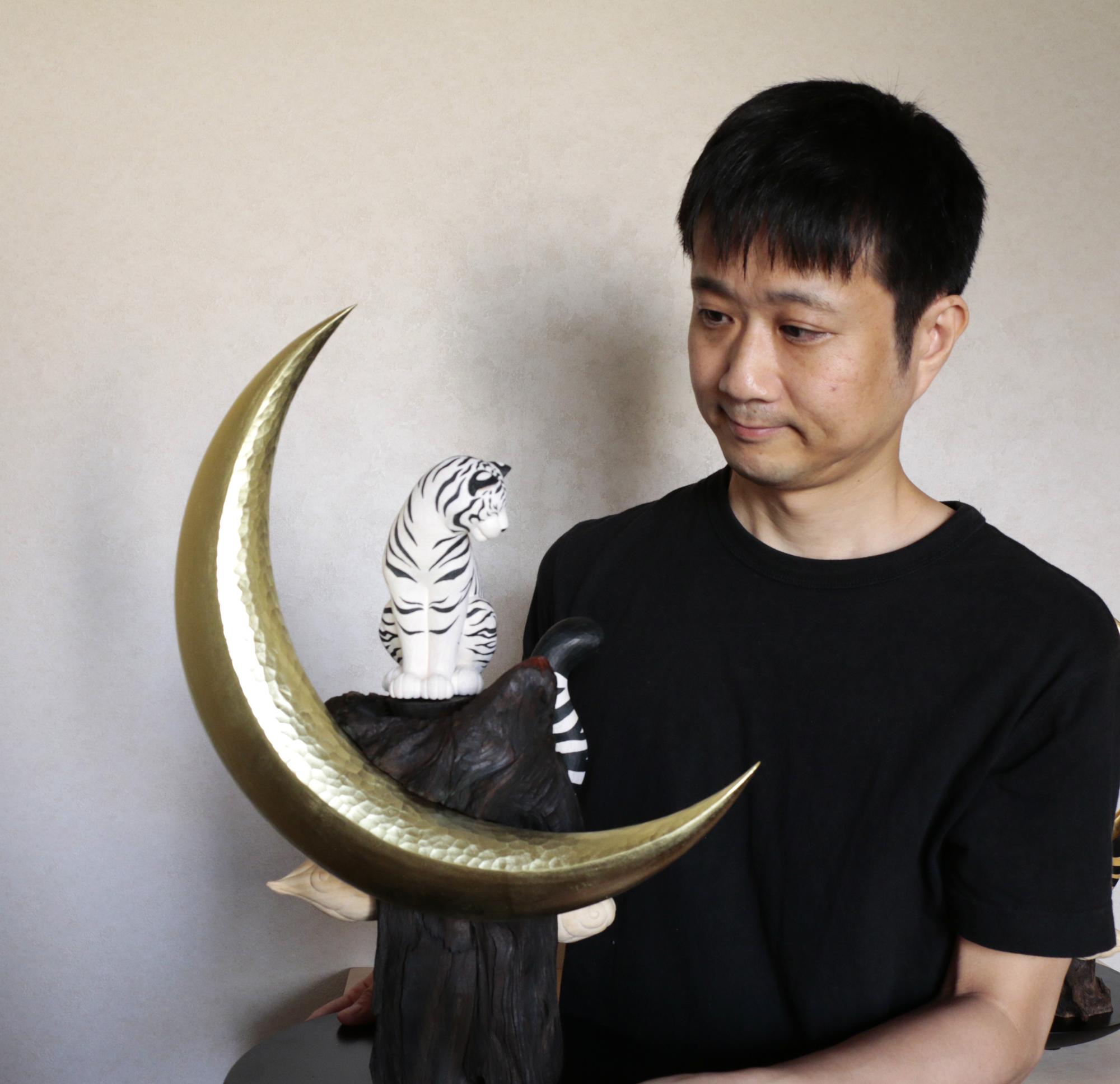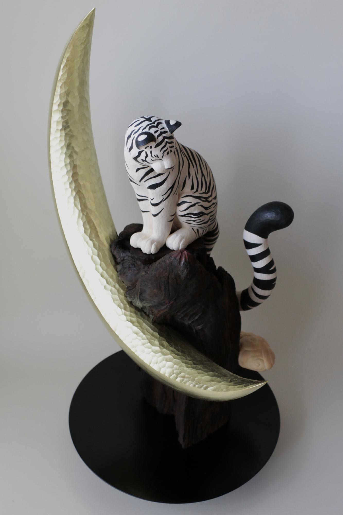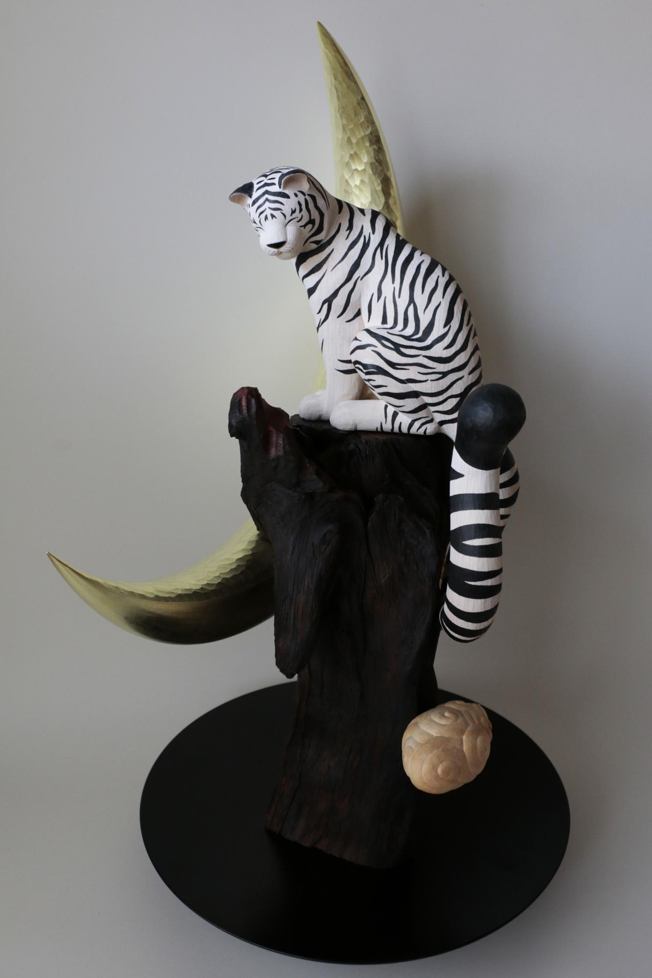 我想像一隻在月夜中忽然出現的白虎。 此作與《日輪的黃虎》成為對照。 牠佇立於高於雲層的山巔,毛皮在月光下閃爍潔白光芒。 我懷著心願創作,希望在不安的夜晚,這隻白虎能一直守護著我們。