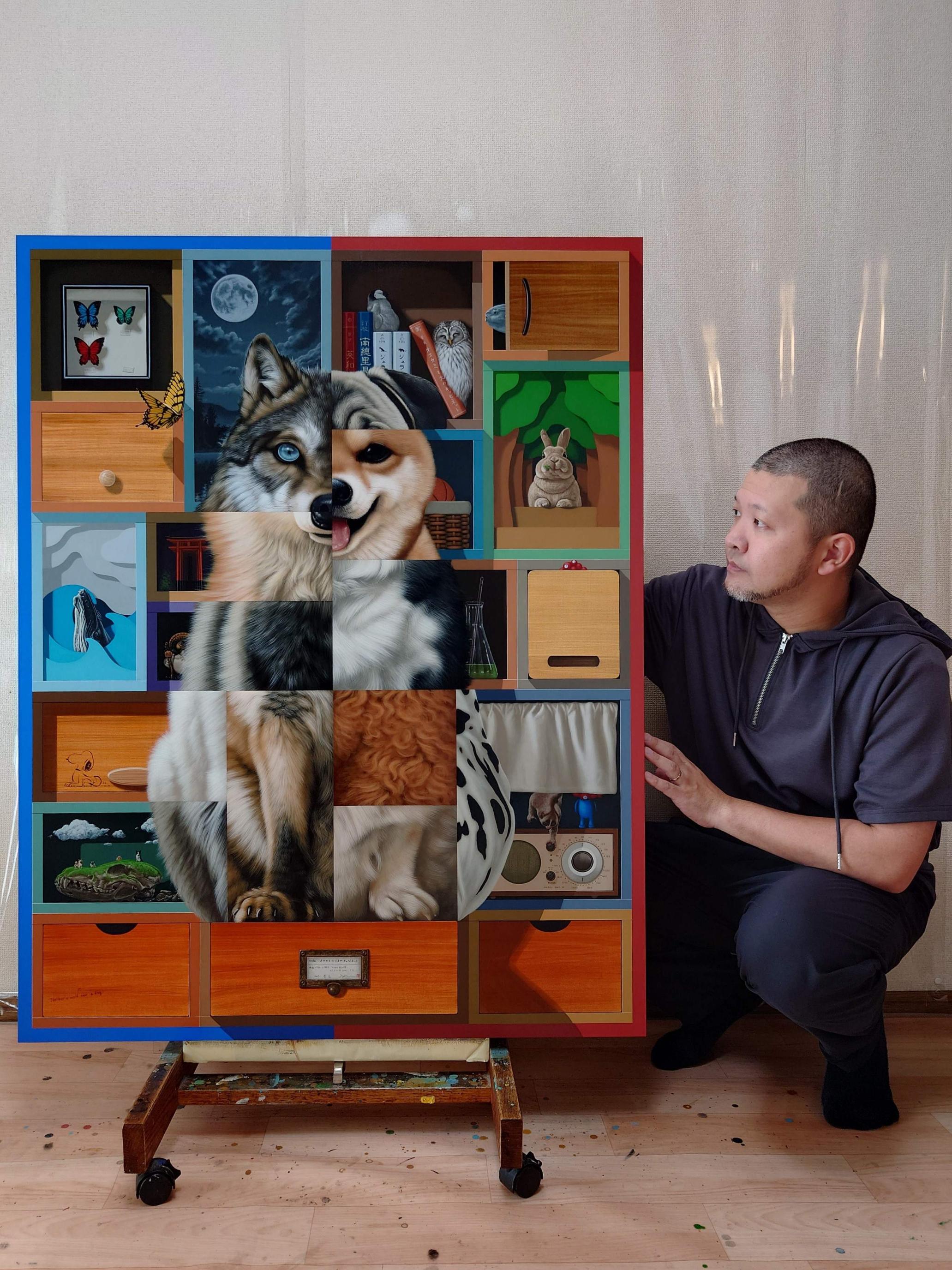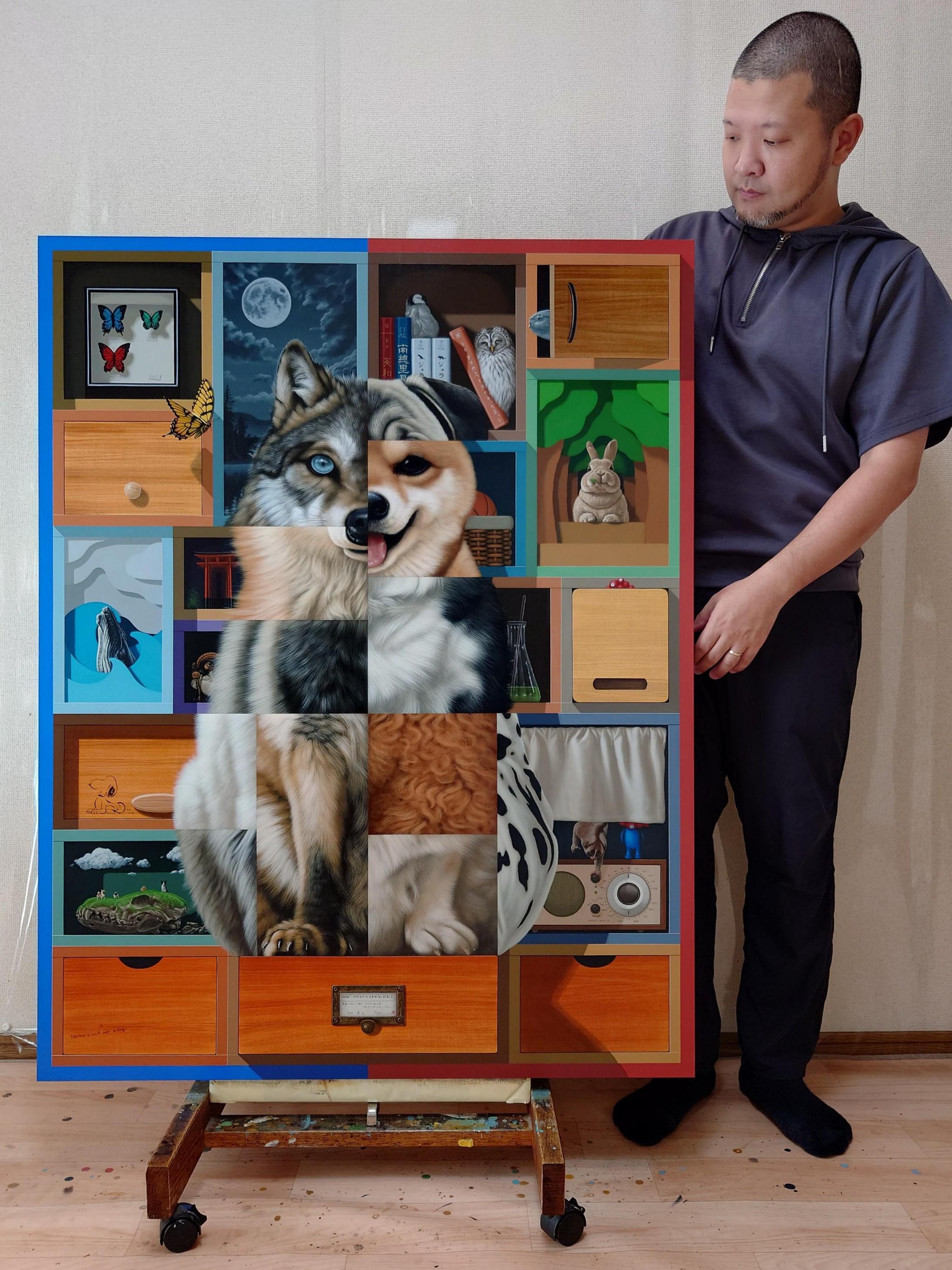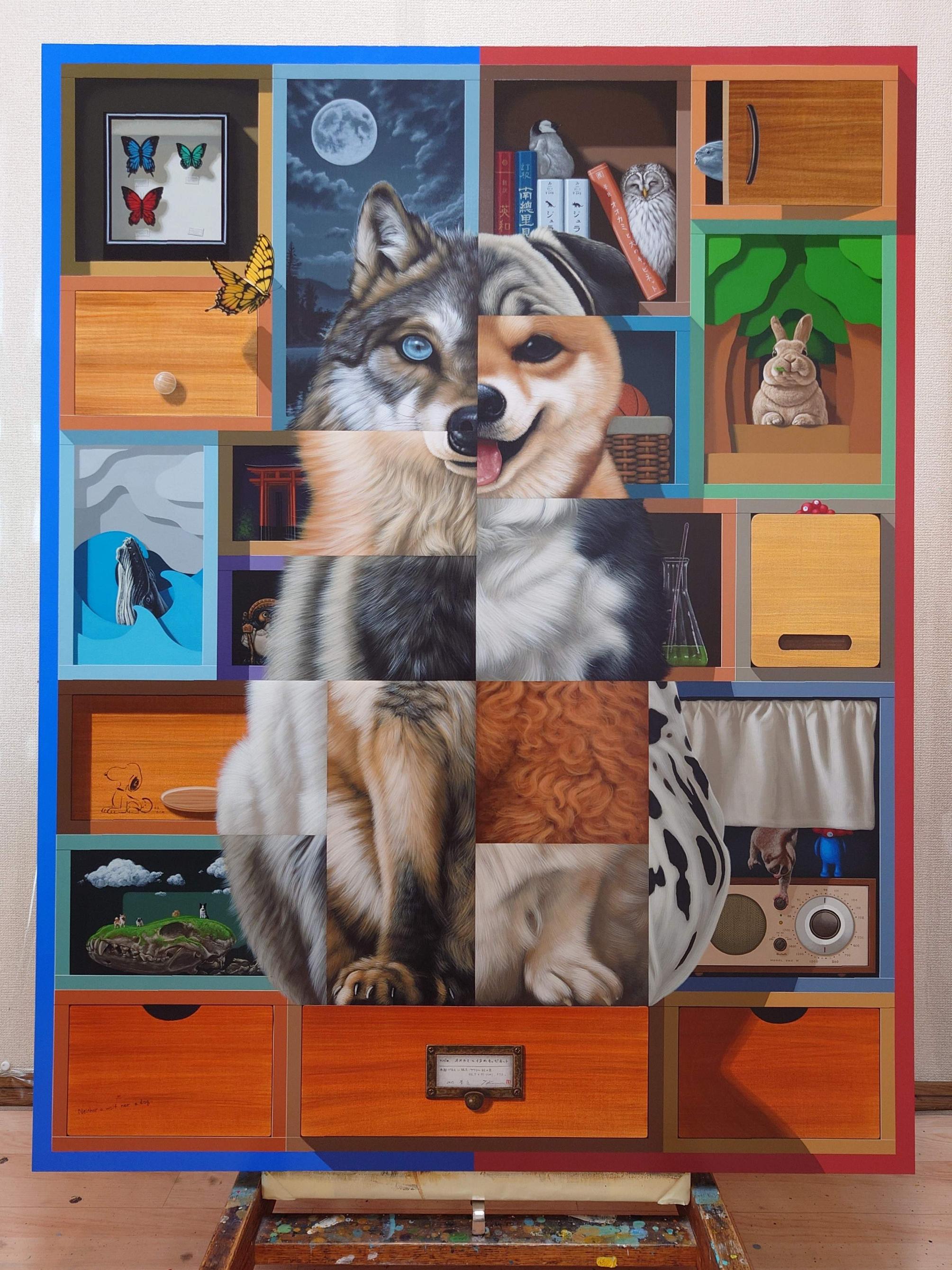 - 簡介:                            《櫃子系列》與我作為畫家的旅程幾乎在同一時間開始。 在這個系列中,我將櫃子比擬為人類社會的框架,把它們作為舞台,描繪在環境問題與人為結構中掙扎的野生動物。 在這件新作中,以狗(狼)為中心的母題,隨著櫃子背景的不同而呈現出變化的形態,為整個系列帶來了新的嘗試。同時,我也受到近期有關「恐狼」透過基因工程復活的新聞啟發,這件作品便是我對那則消息的個人回應。 作為一個細微但重要的細節,這是系列中第一件在外框上採用雙色的作品——左側為藍色,右側為紅色。這暗示了狗作為被馴化的寵物與作為野生動物之間的二元性,同時也喚起了膠囊的意象,暗指基因操作。 此外,紅與藍的選擇並非偶然,因為它們同時也是大阪世博會的主色。 (而在畫中,您甚至可能發現某個世博角色的身影——請細心尋找。)