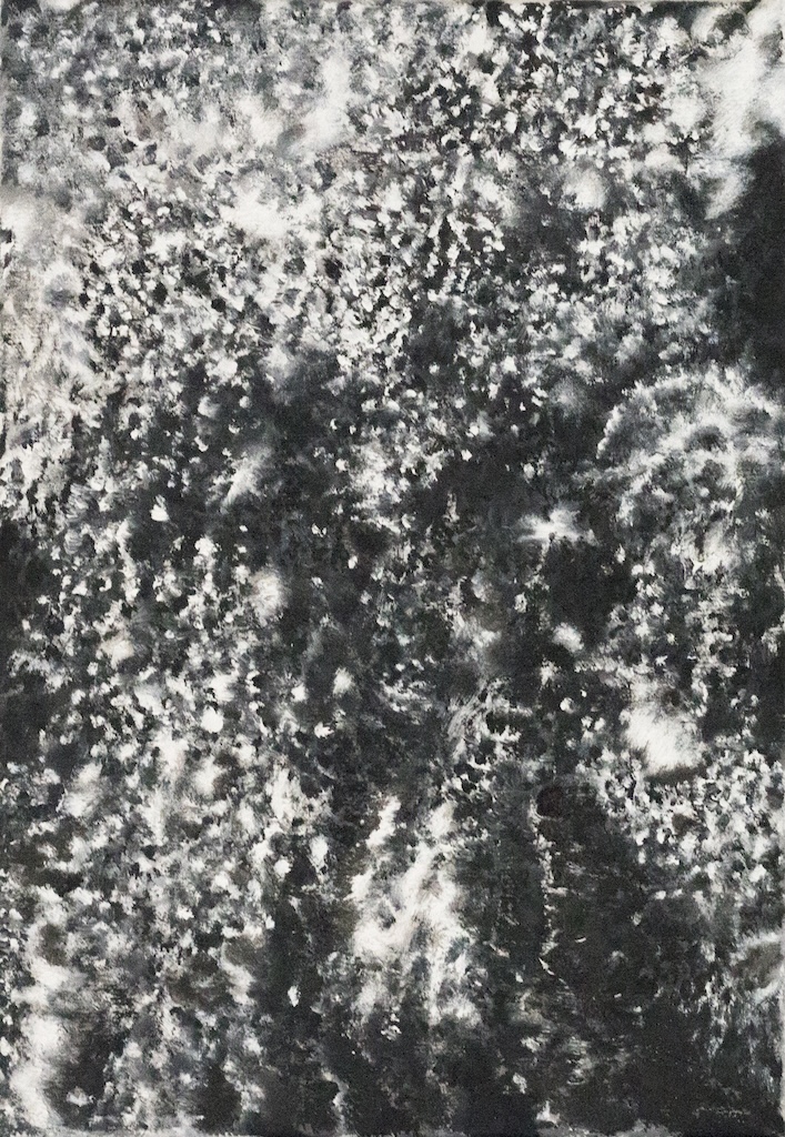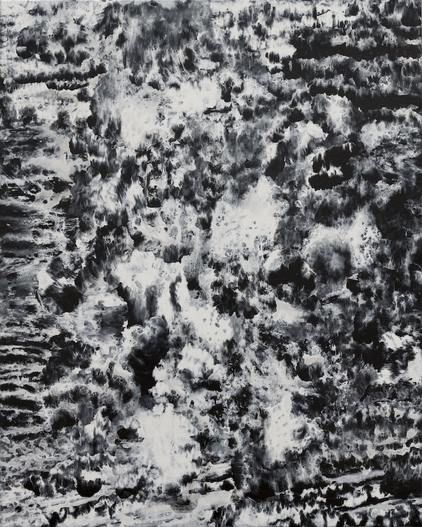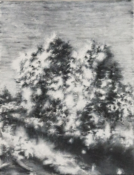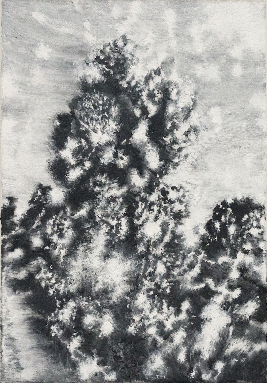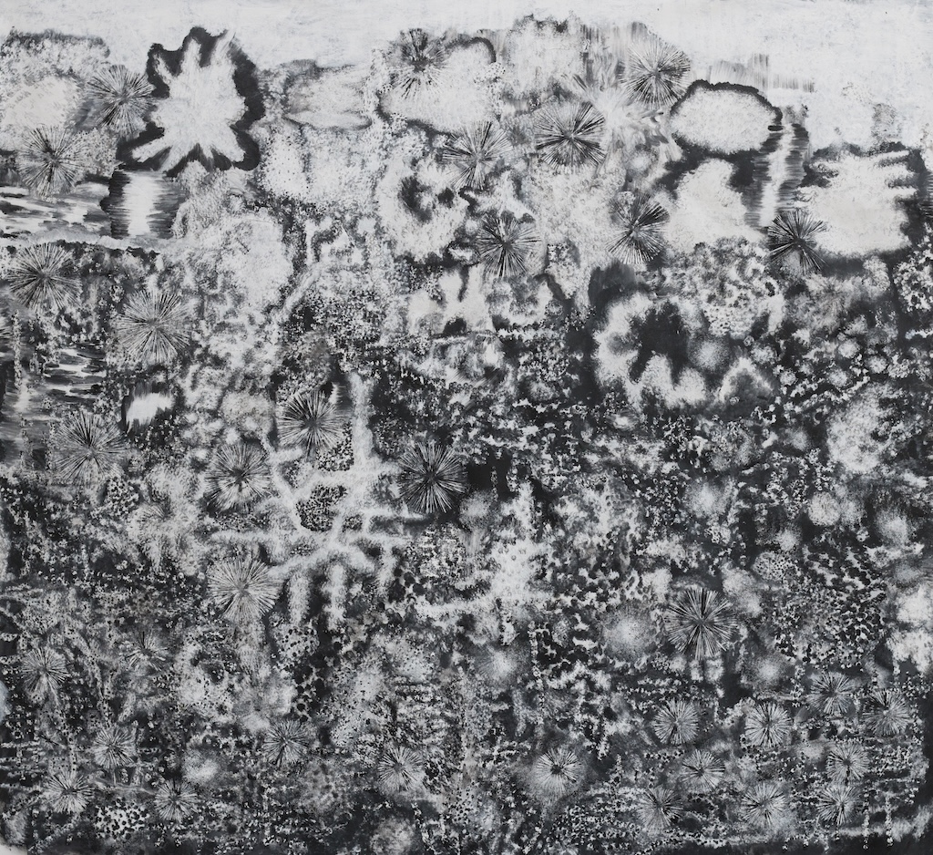 His practice has been deeply influenced by his early experiences with imagery and animation. He translates the logic of “rendering” into his way of seeing landscapes: just as virtual constructions gradually take shape in the rendering process, he observes nature as though deconstructing its surfaces layer by layer, revealing its underlying structures and truths. This approach also informs his choice of black and white over color—whereas color, in his view, often obscures deeper connections, black and white exposes the essential structures more directly. At times, Chen brings his canvases into natural settings, allowing weather, light, and environmental conditions to intervene in the act of painting. For him, this process is not simply about representation but about confronting the “wild” state of being—a condition defined not by outward ferocity, but by the genuine psychological experiences that arise when facing uncertainty: doubt, fear, frustration, and challenge. It is within this state of wildness that he seeks to encounter the most honest self.
