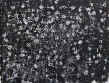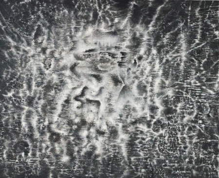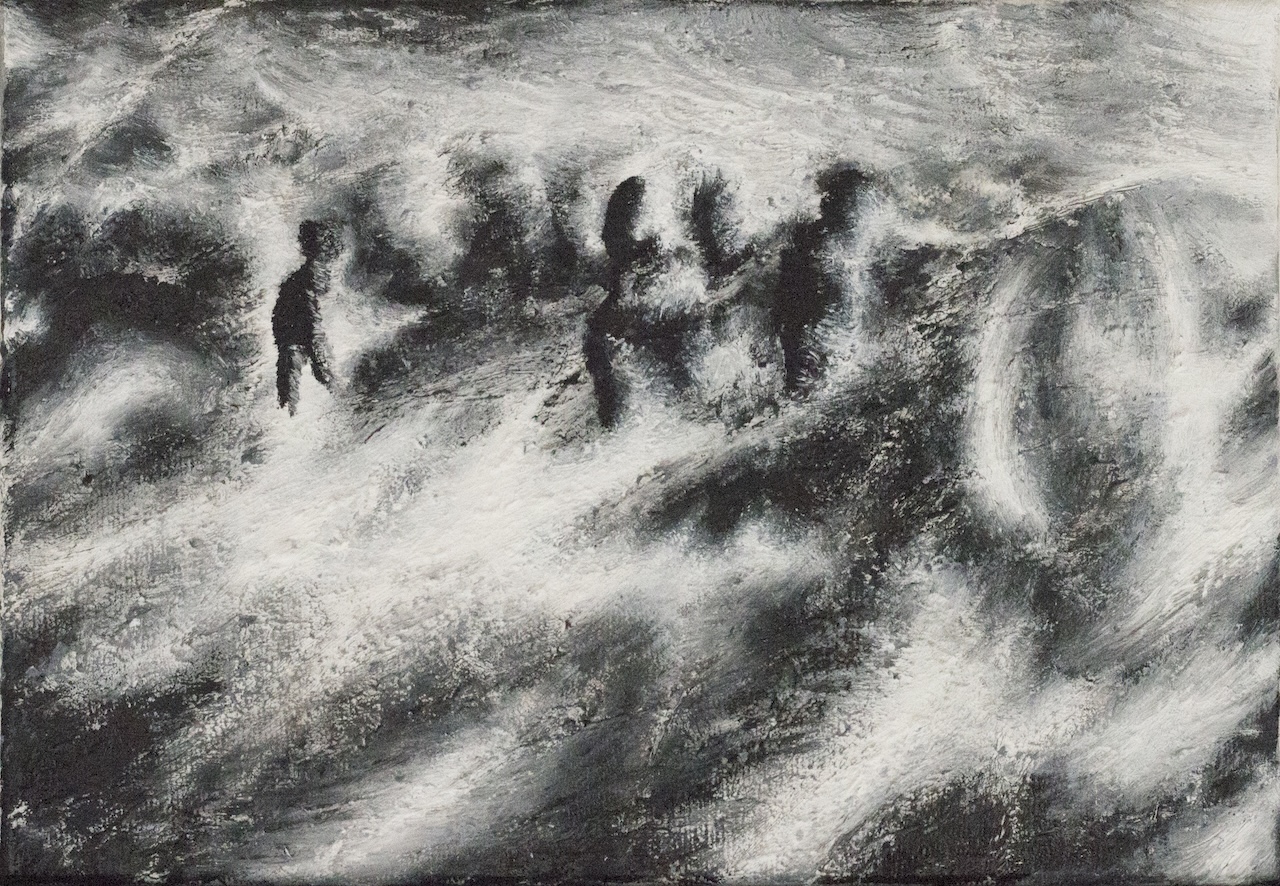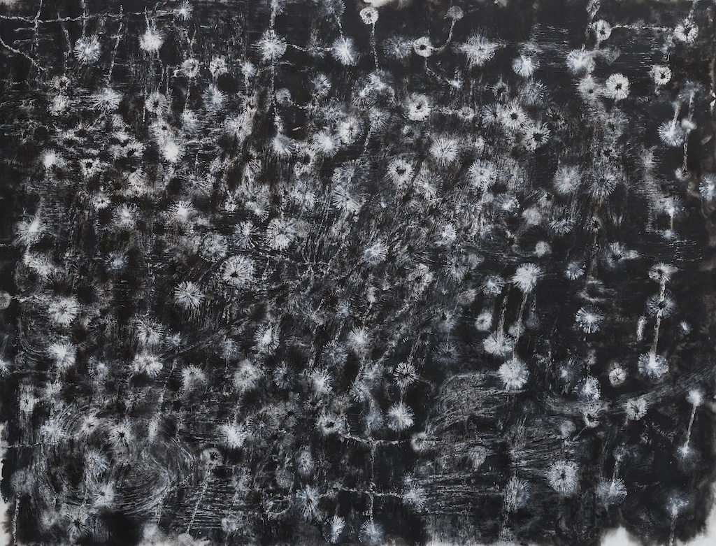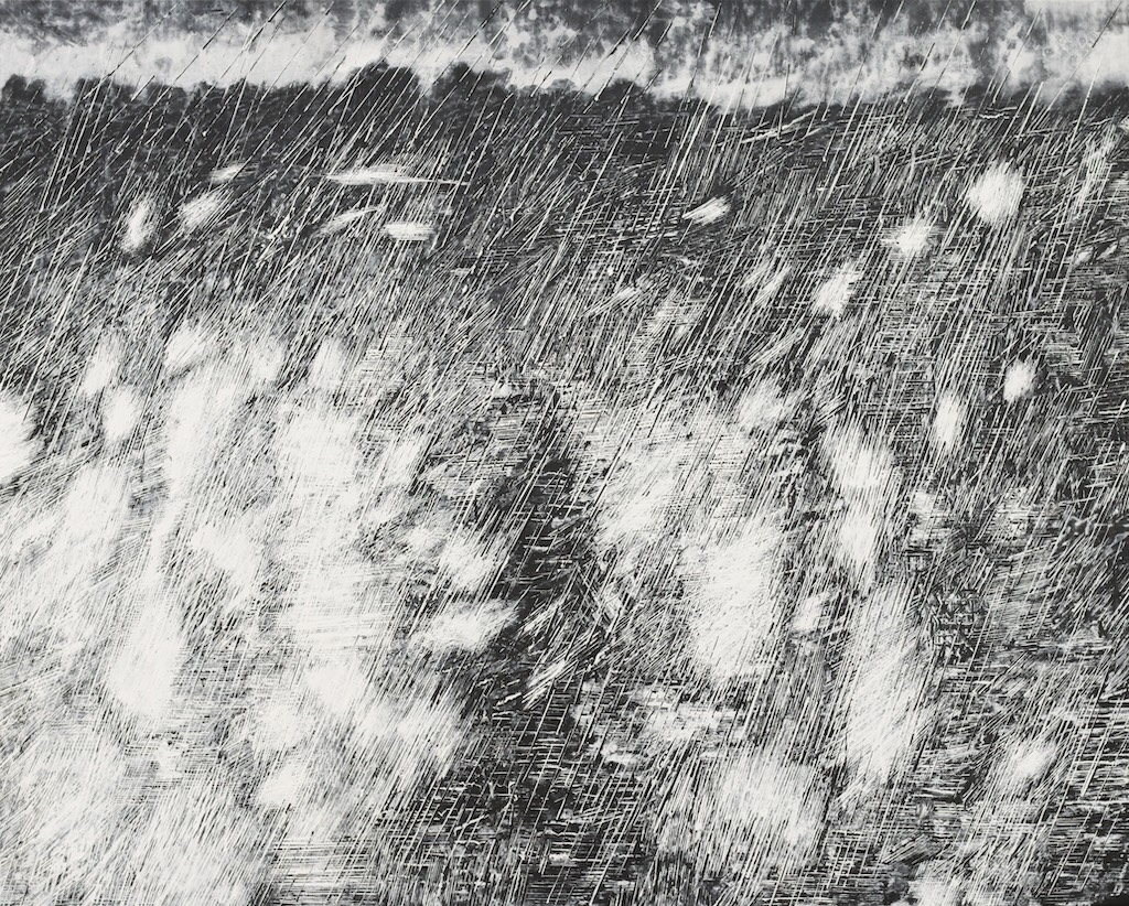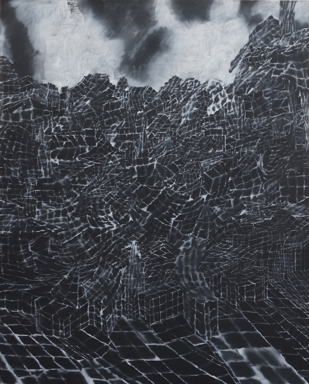 His practice has been deeply influenced by his early experiences with imagery and animation. He translates the logic of “rendering” into his way of seeing landscapes: just as virtual constructions gradually take shape in the rendering process, he observes nature as though deconstructing its surfaces layer by layer, revealing its underlying structures and truths. This approach also informs his choice of black and white over color—whereas color, in his view, often obscures deeper connections, black and white exposes the essential structures more directly. At times, Chen brings his canvases into natural settings, allowing weather, light, and environmental conditions to intervene in the act of painting. For him, this process is not simply about representation but about confronting the “wild” state of being—a condition defined not by outward ferocity, but by the genuine psychological experiences that arise when facing uncertainty: doubt, fear, frustration, and challenge. It is within this state of wildness that he seeks to encounter the most honest self.